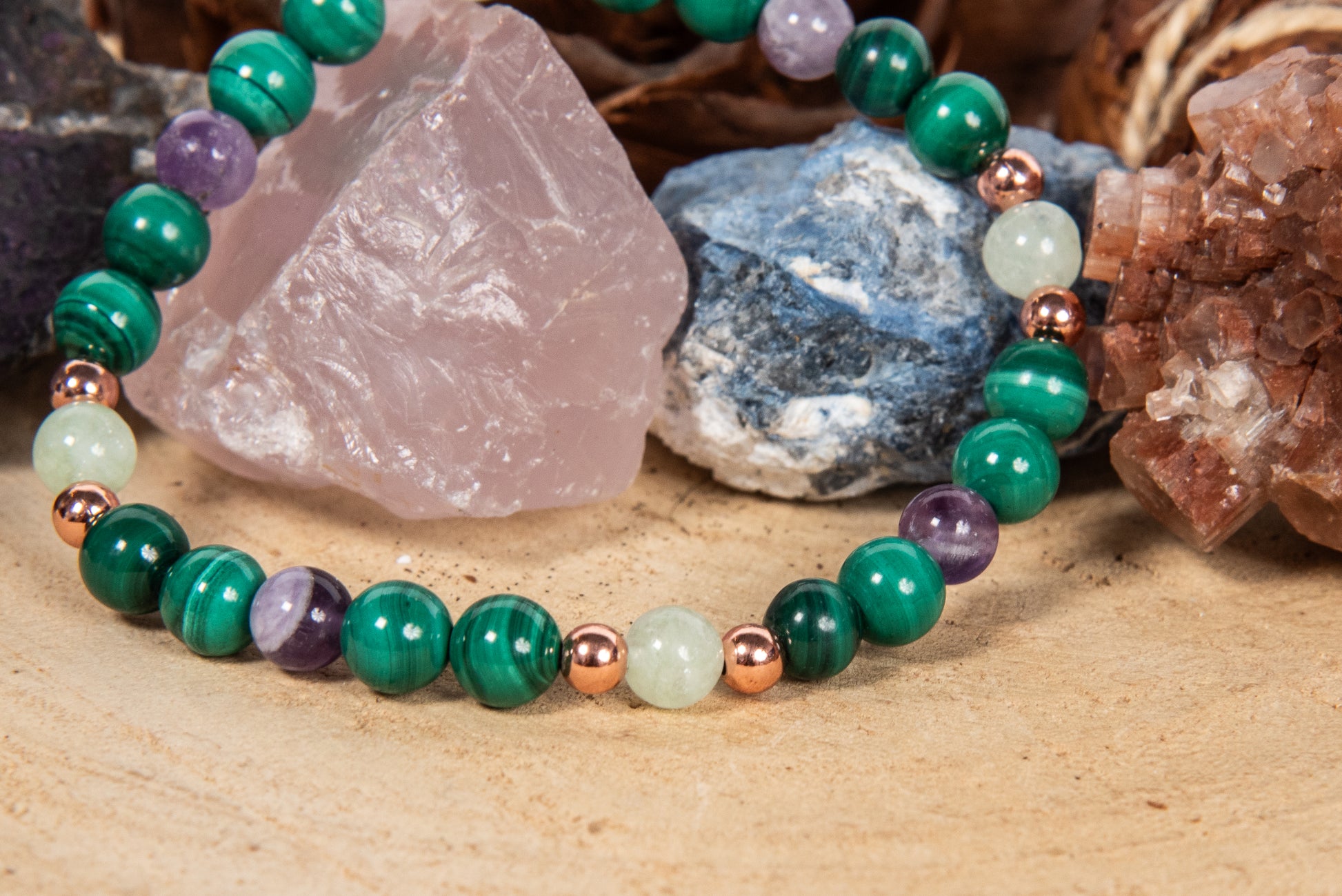Bracciale perle 6 mm ametista, crisoprasio, malachite, rame