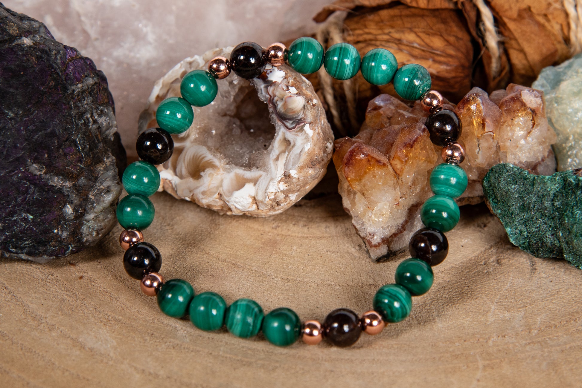 Bracciale perle 6 mm granato, malachite, rame