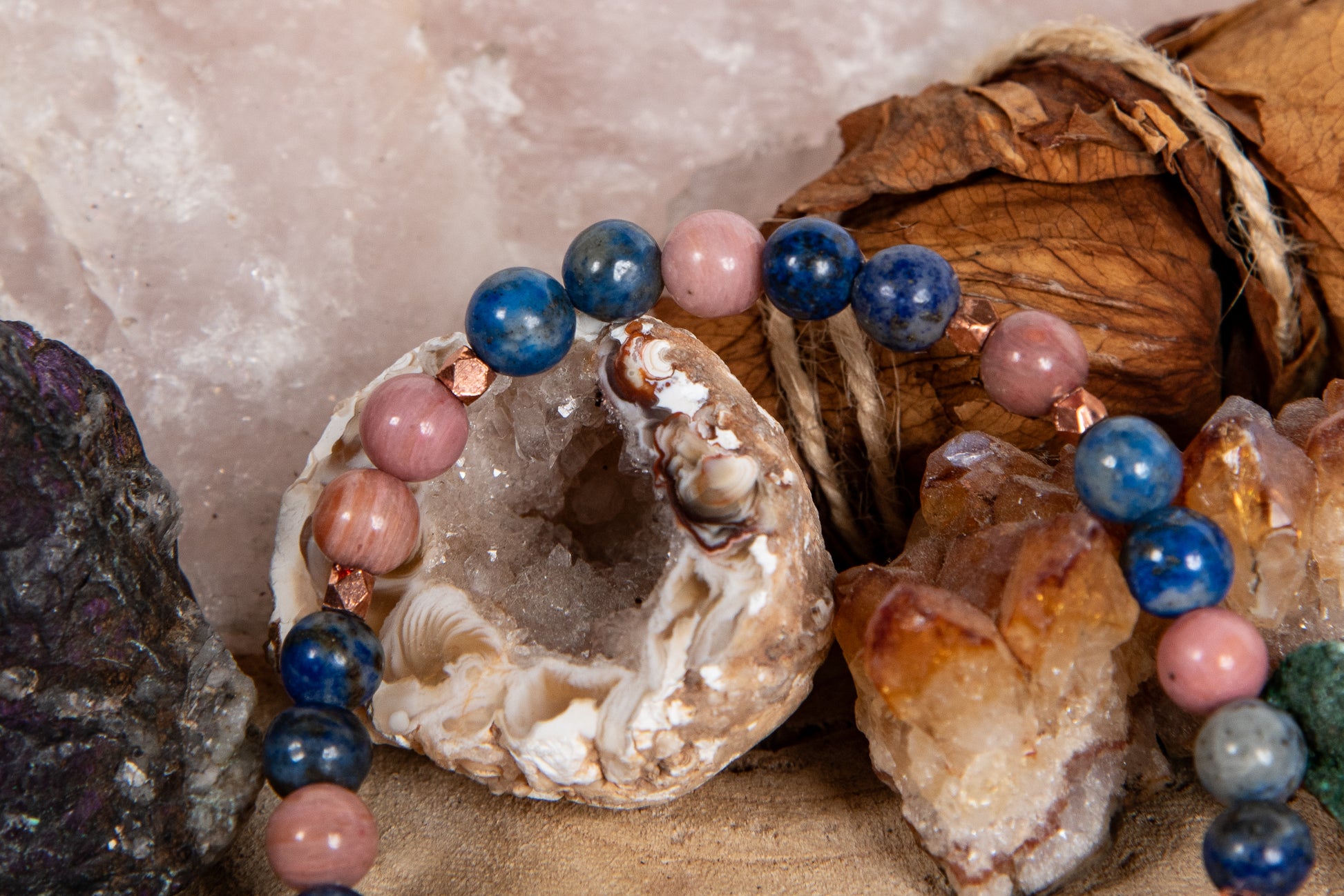 Bracciale perle 6 mm lapislazzuli, rodonite, rame