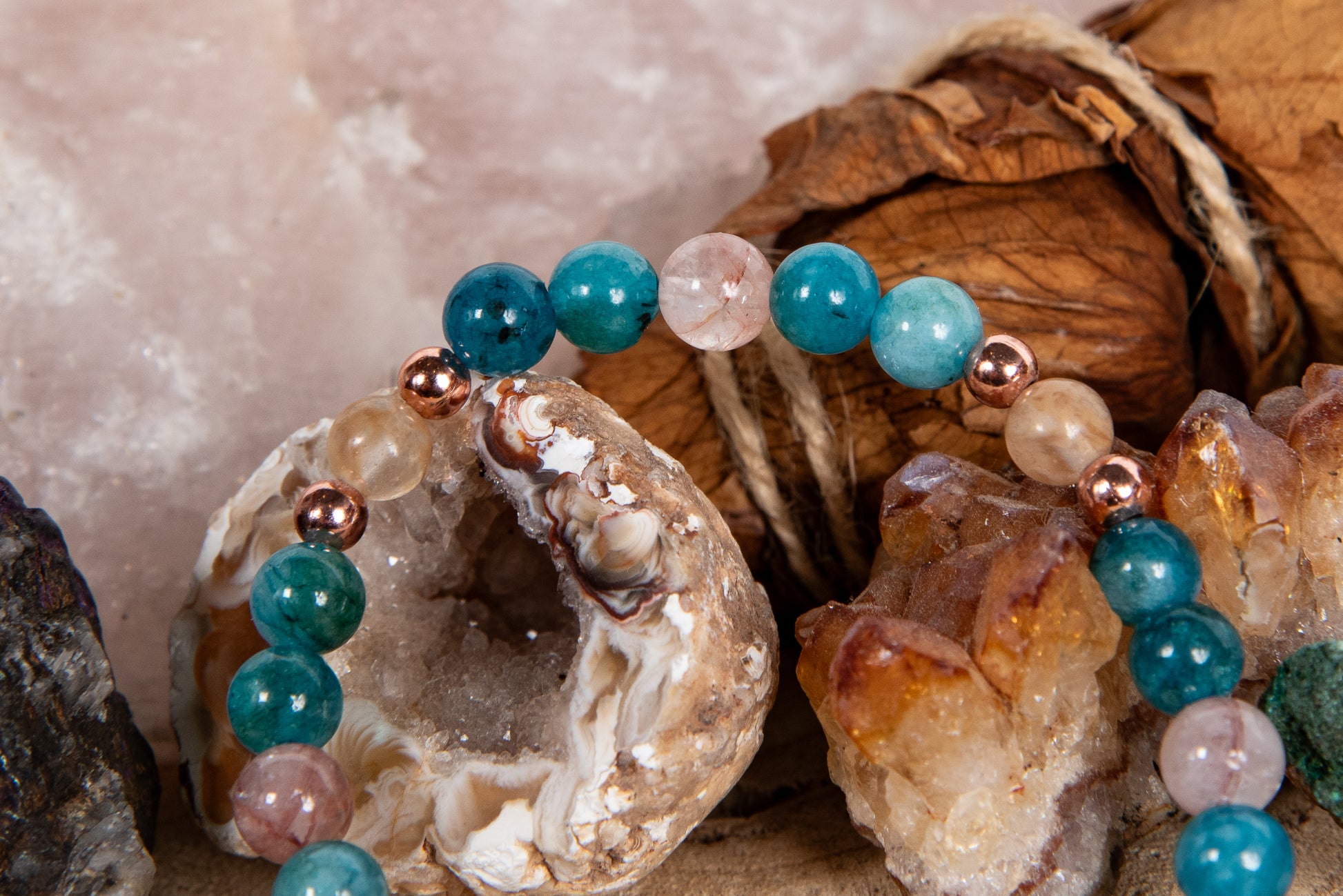 Bracciale perle 6 mm quarzo ematoide, quarzo citrino, apatite, rame