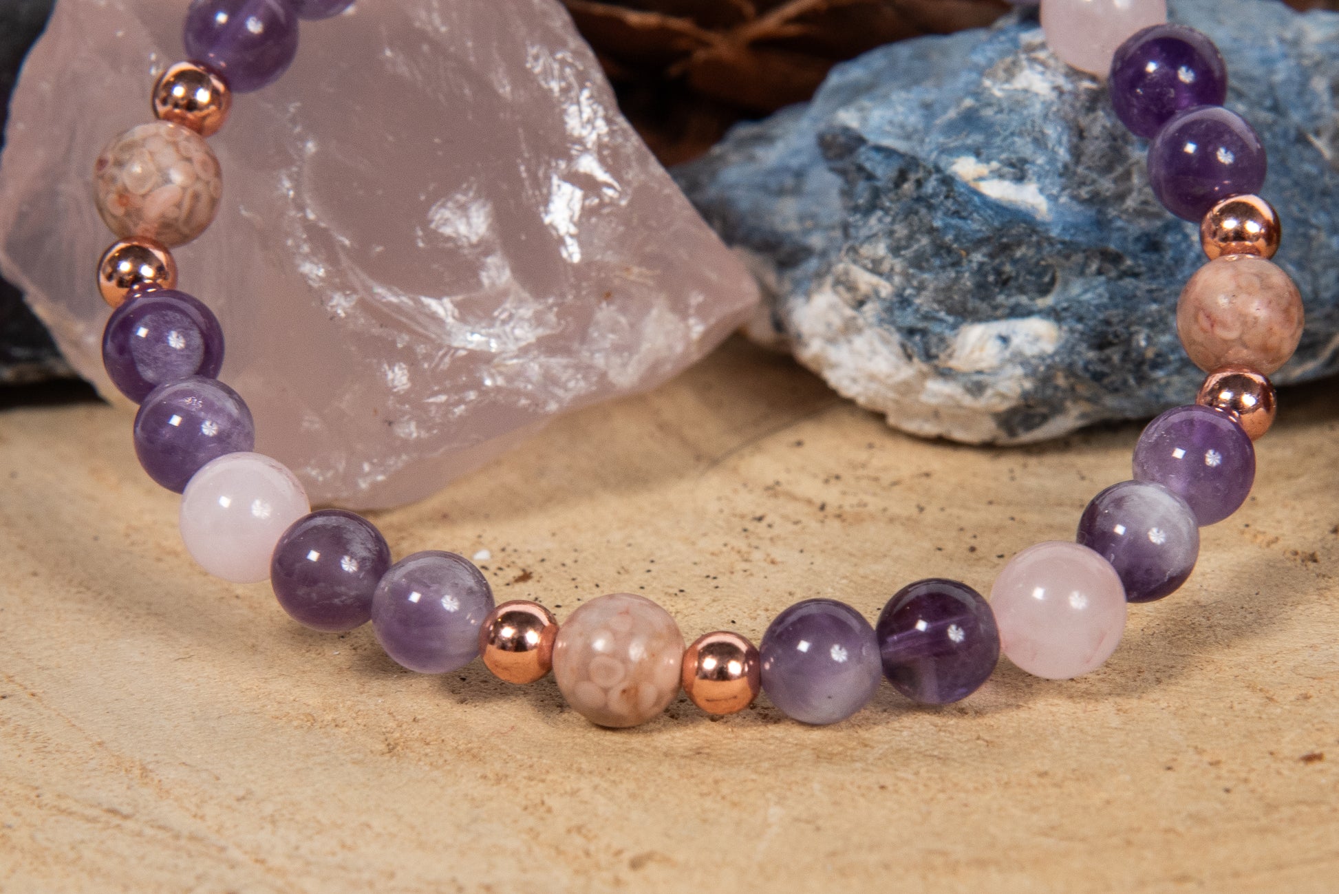 Bracciale perle 6 mm ametista, quarzo rosa, rodonite, rame