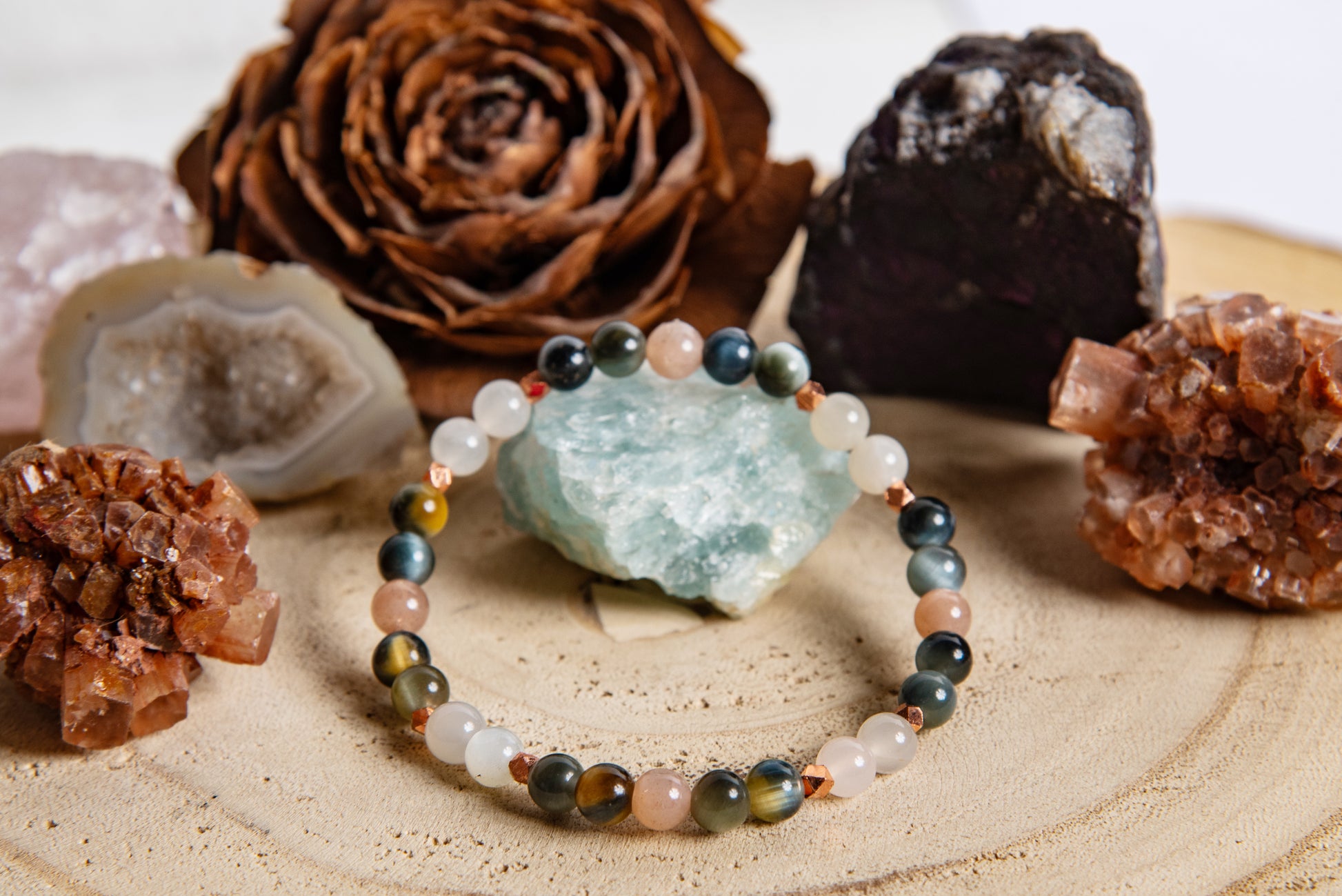 Bracciale perle 6 mm pietra di luna, occhio di falco, rame