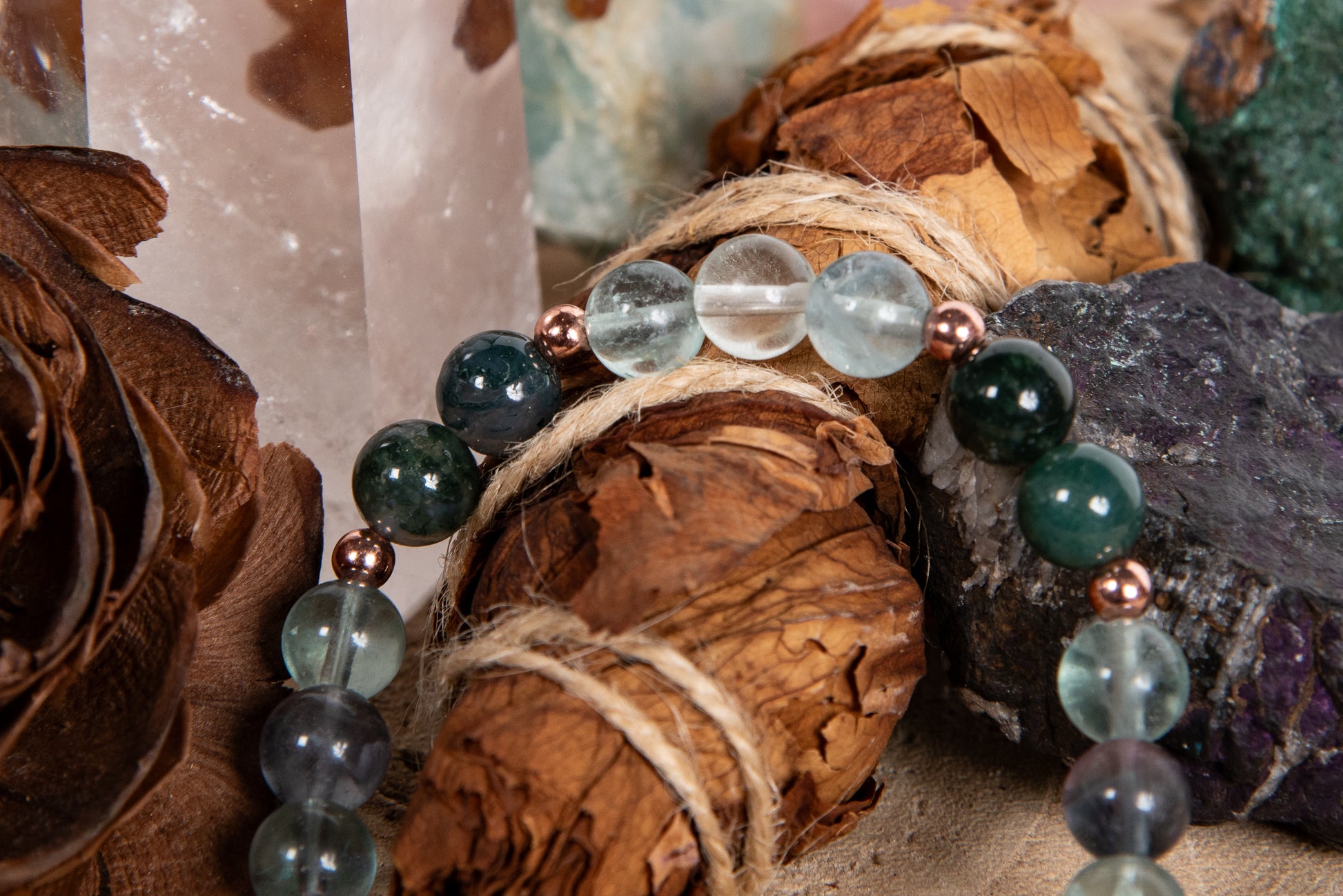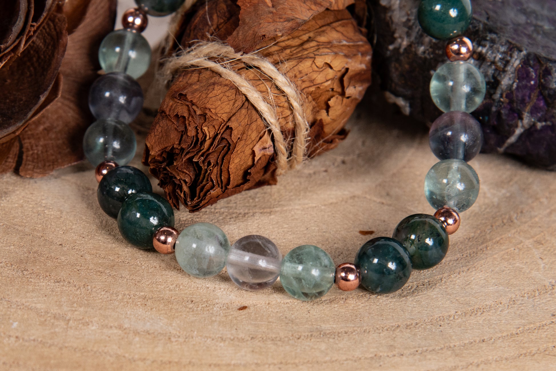 Bracciale perle 8 mm fluorite, agata muschiata, rame
