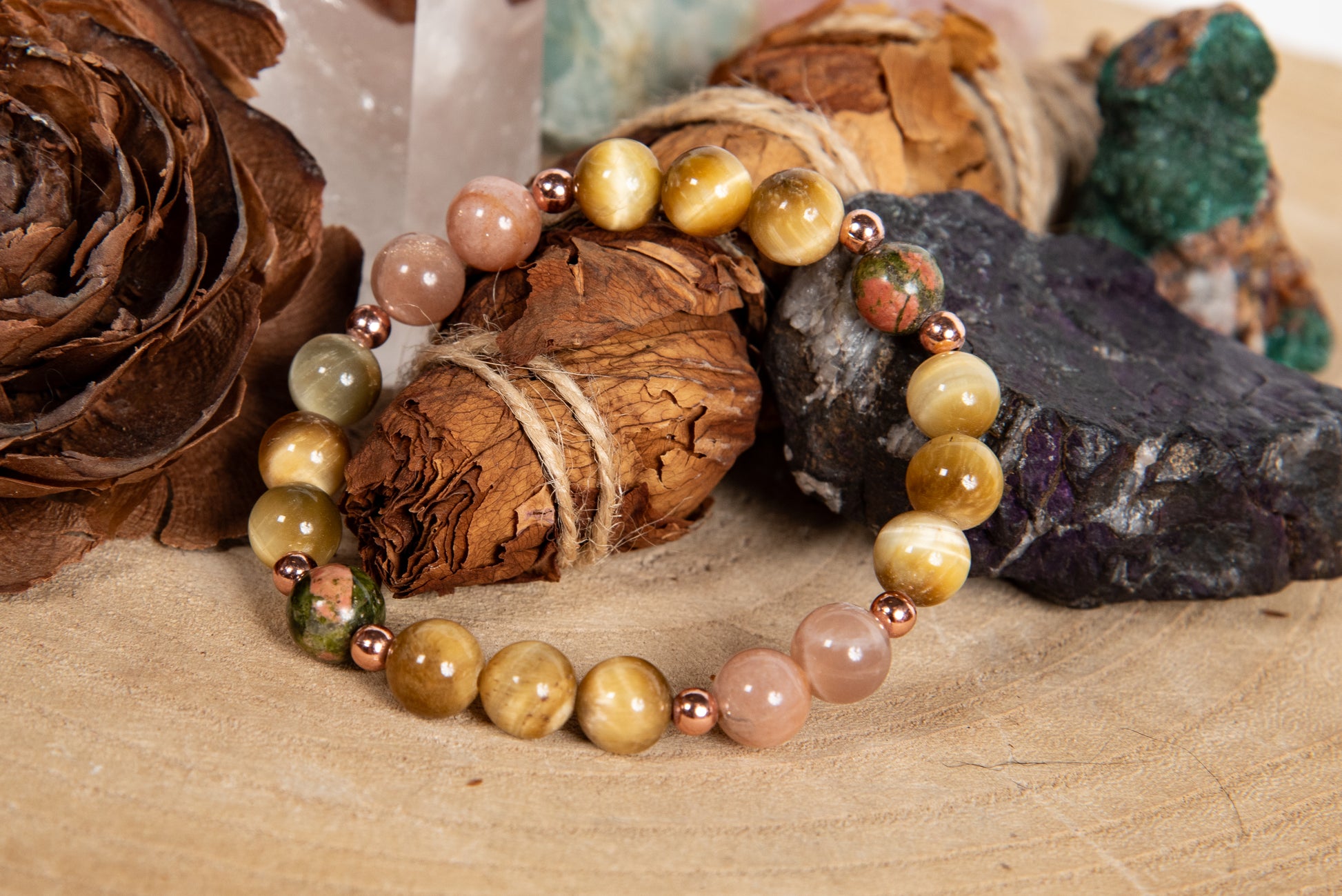 Bracciale perle 8 mm occhio di tigre dorato, pietra di luna, unakite, rame