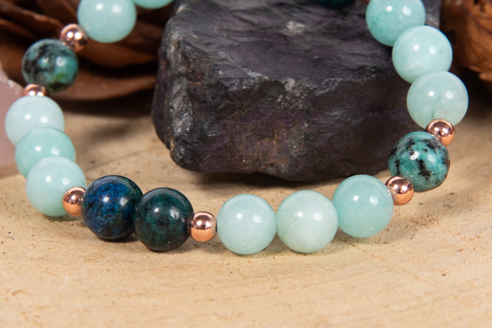 Bracciale perle 8 mm amazzonite, turchese africano, azzurrite, rame