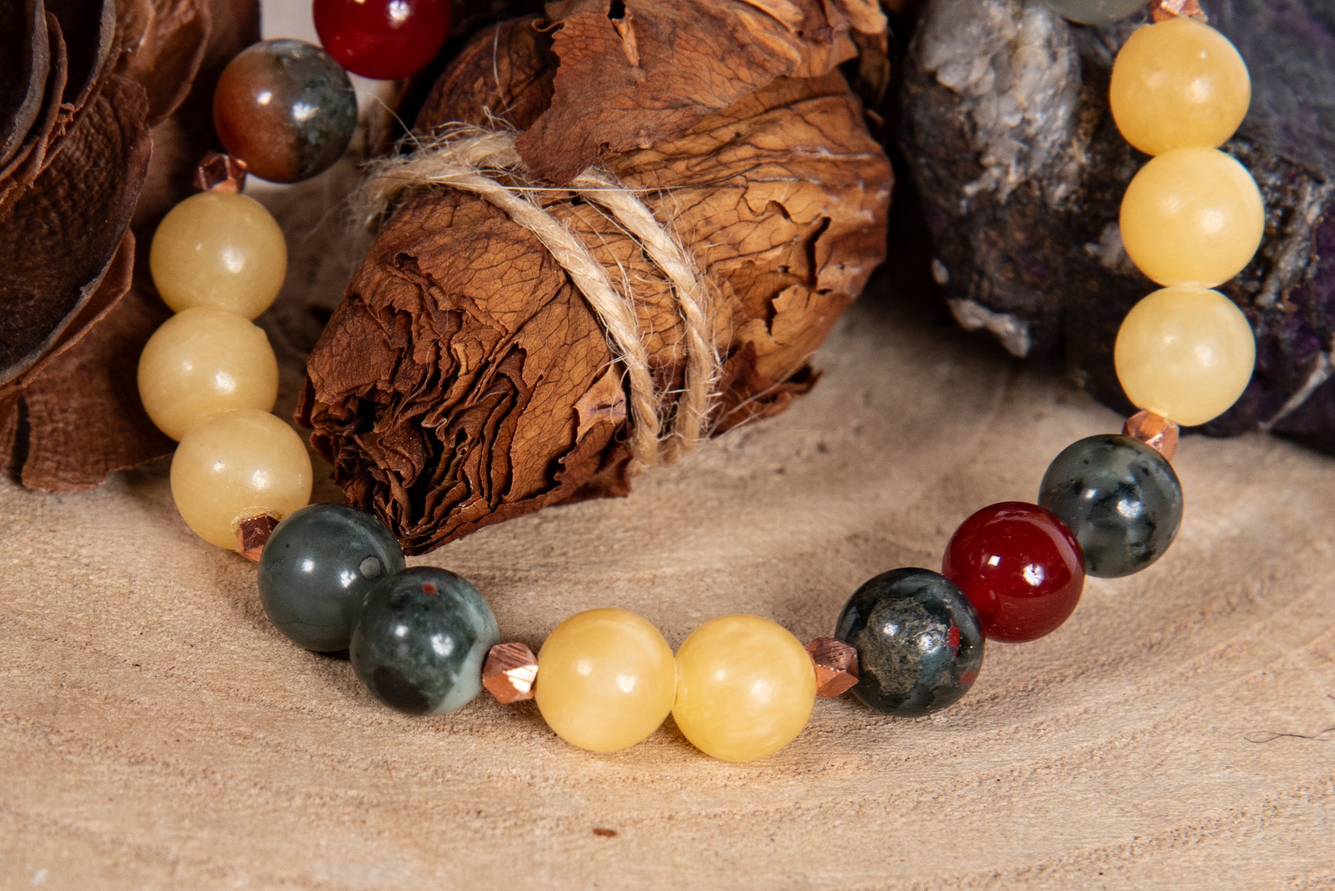 Bracciale perle 8 mm calcite gialla, eliotropio, agata rossa, rame