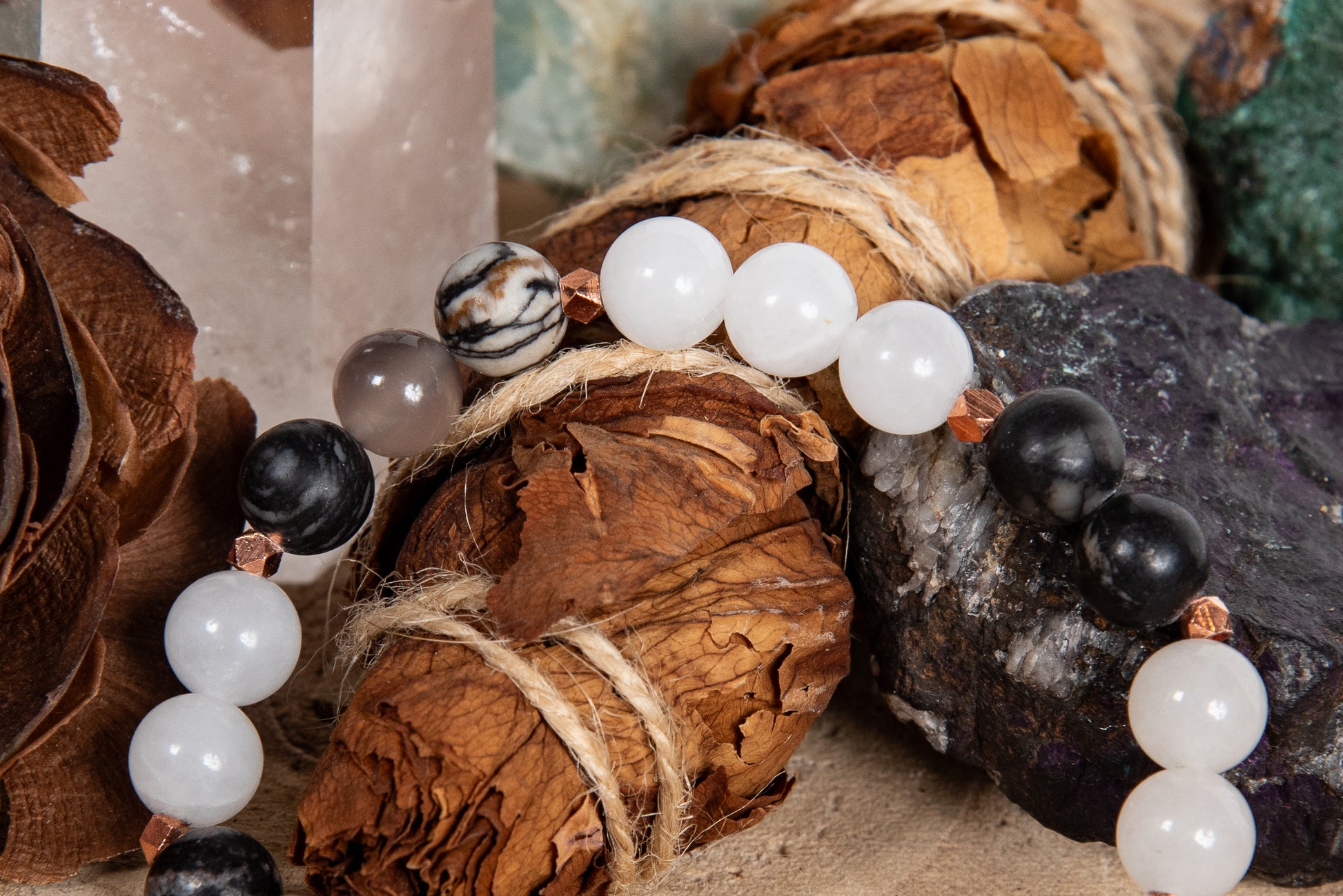 Bracciale perle 8 mm diaspro zebrato, agata bianca, agata grigia, rame