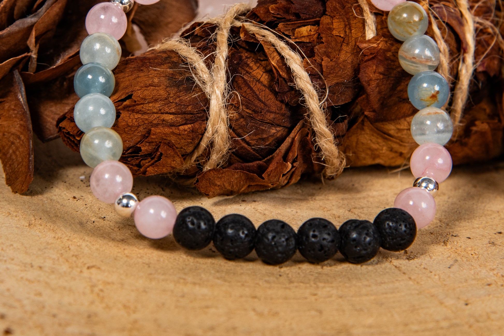 Calcite blu, quarzo rosa, lava, argento 925