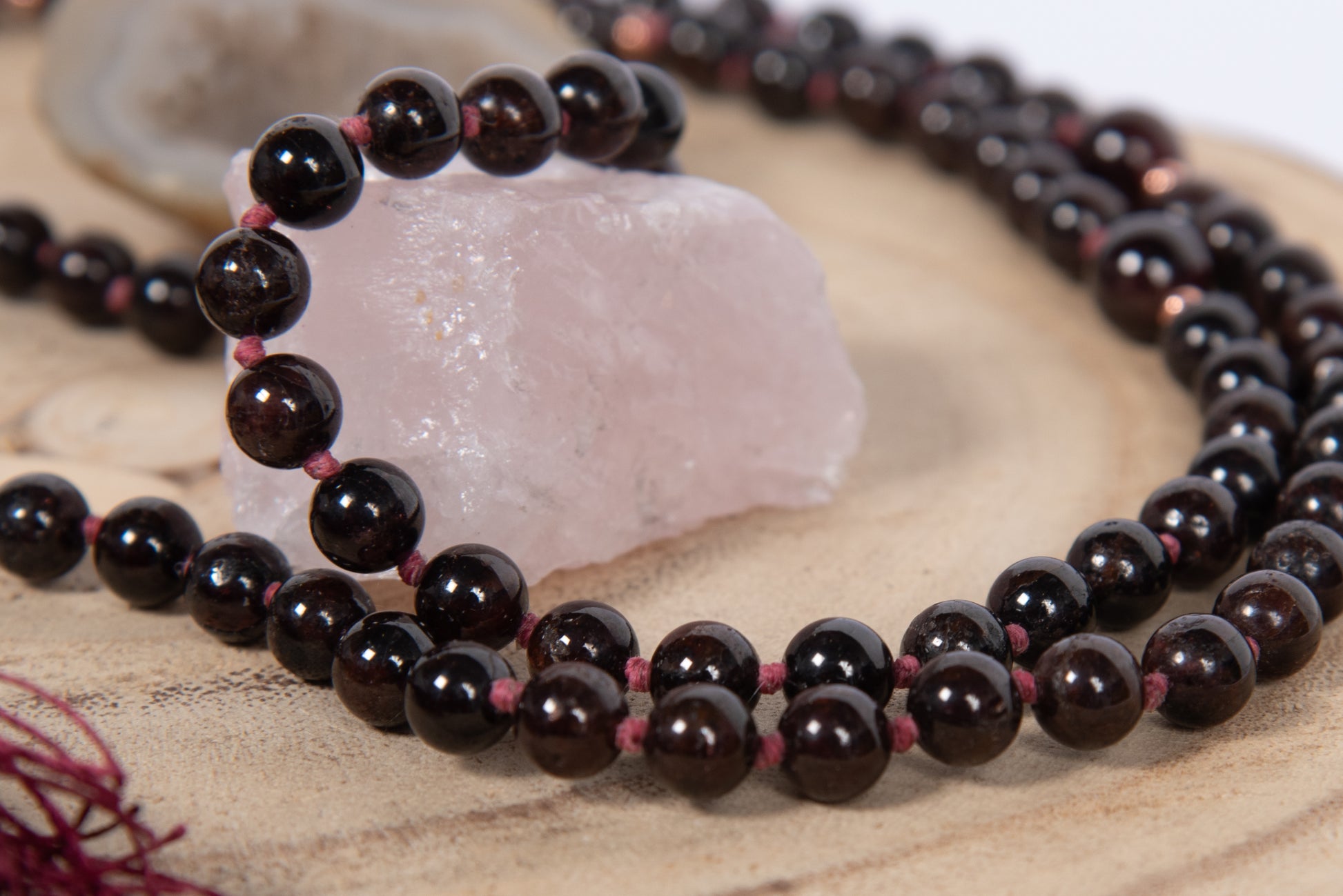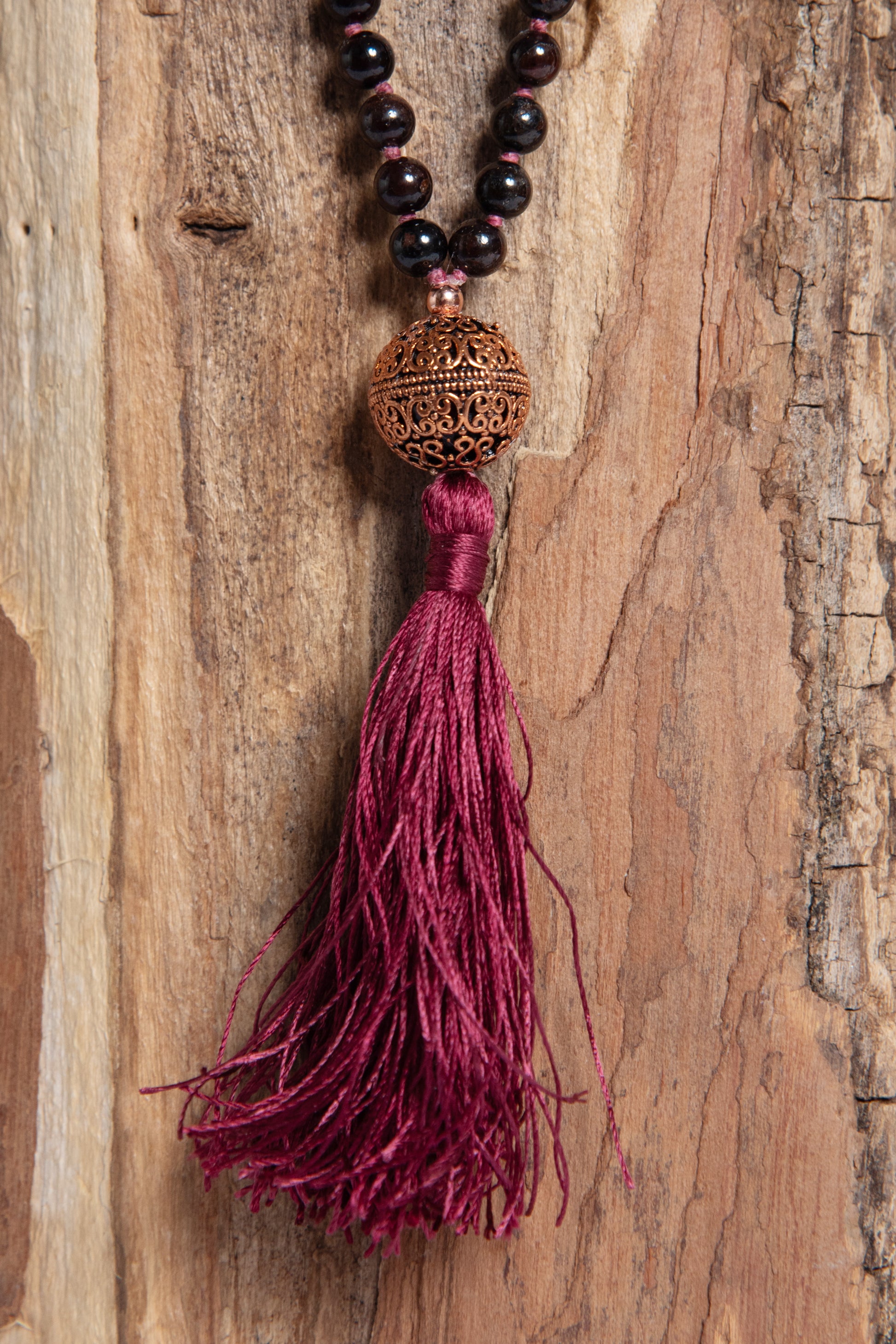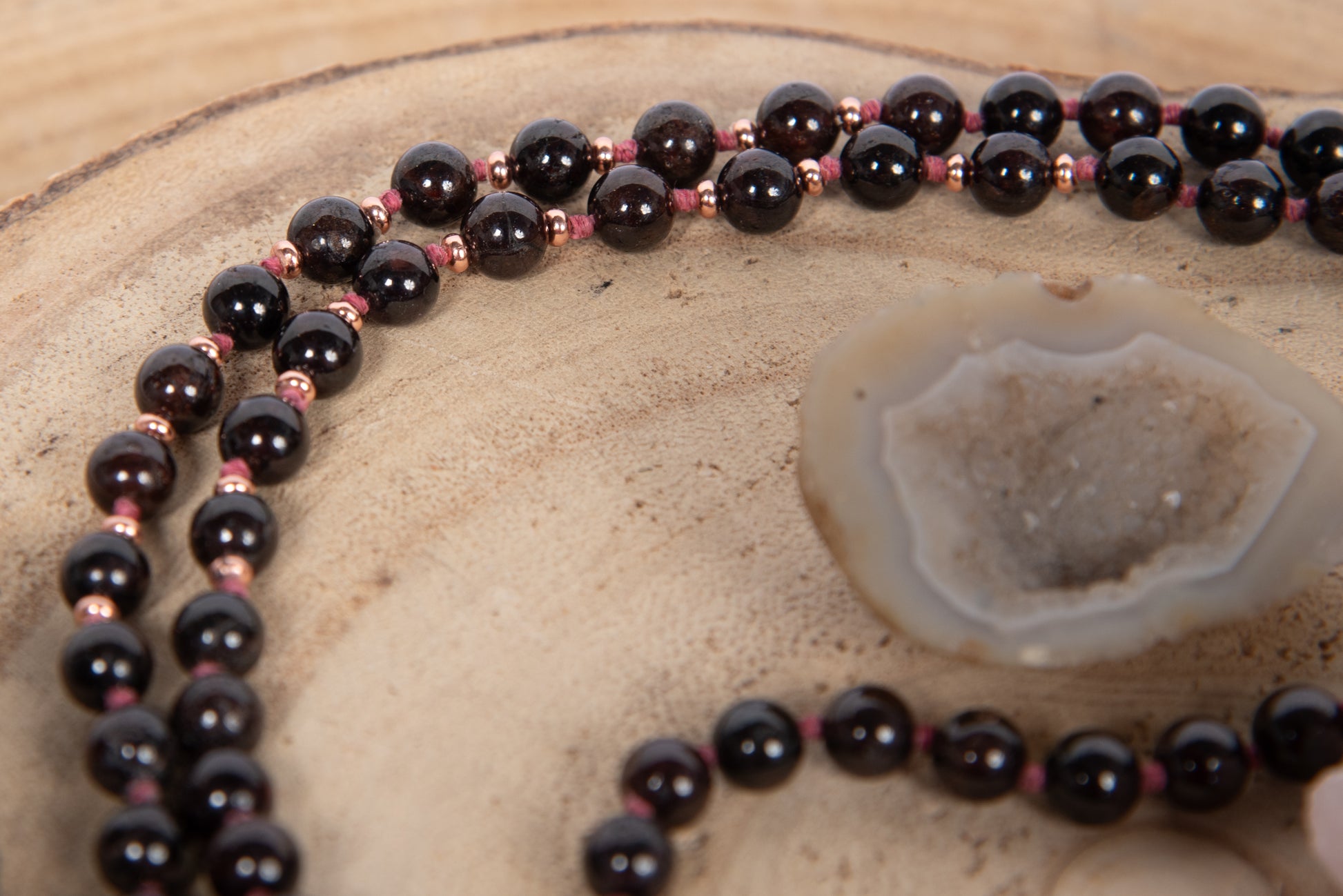 Mala 108 con pietre naturali di Granato, Perla Guru Rame, rame