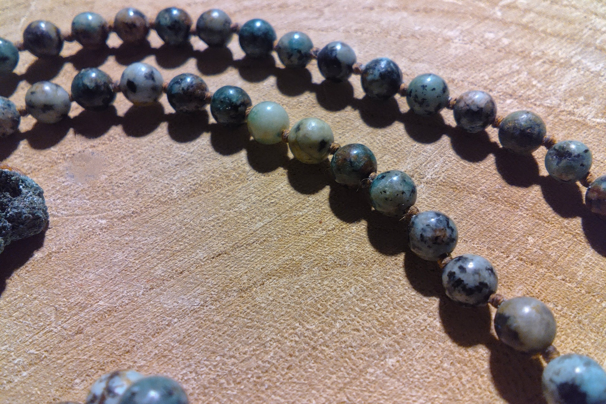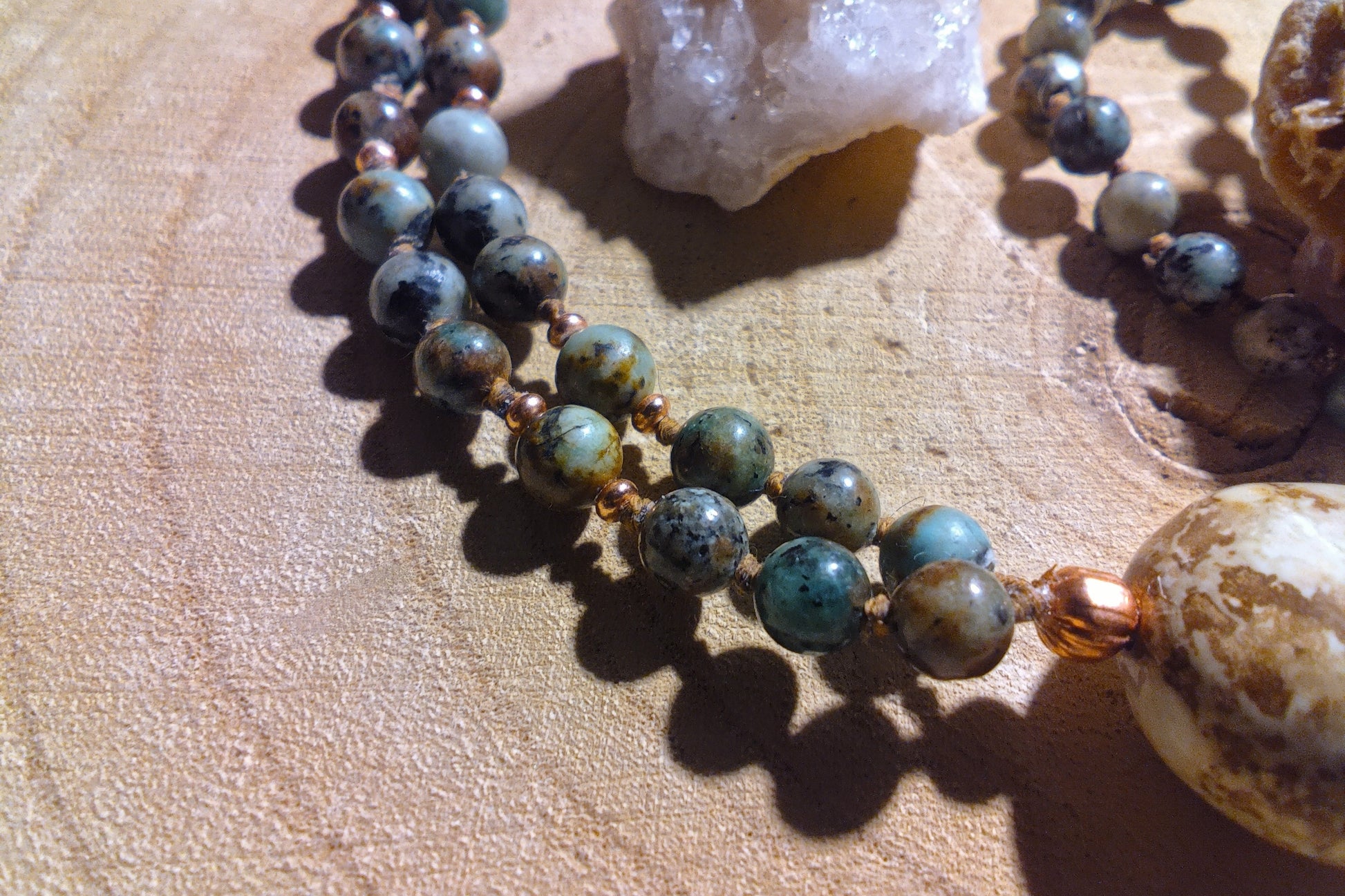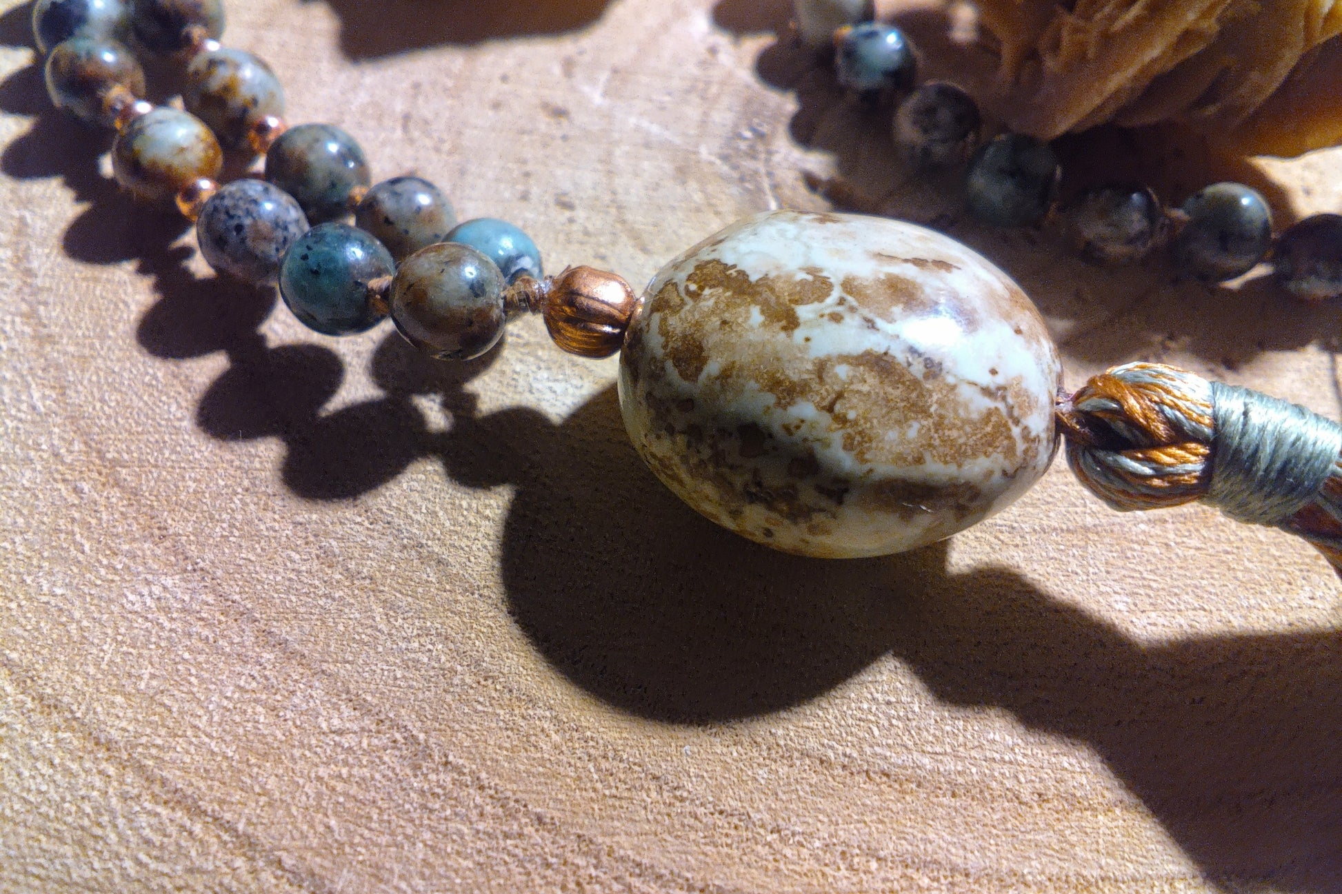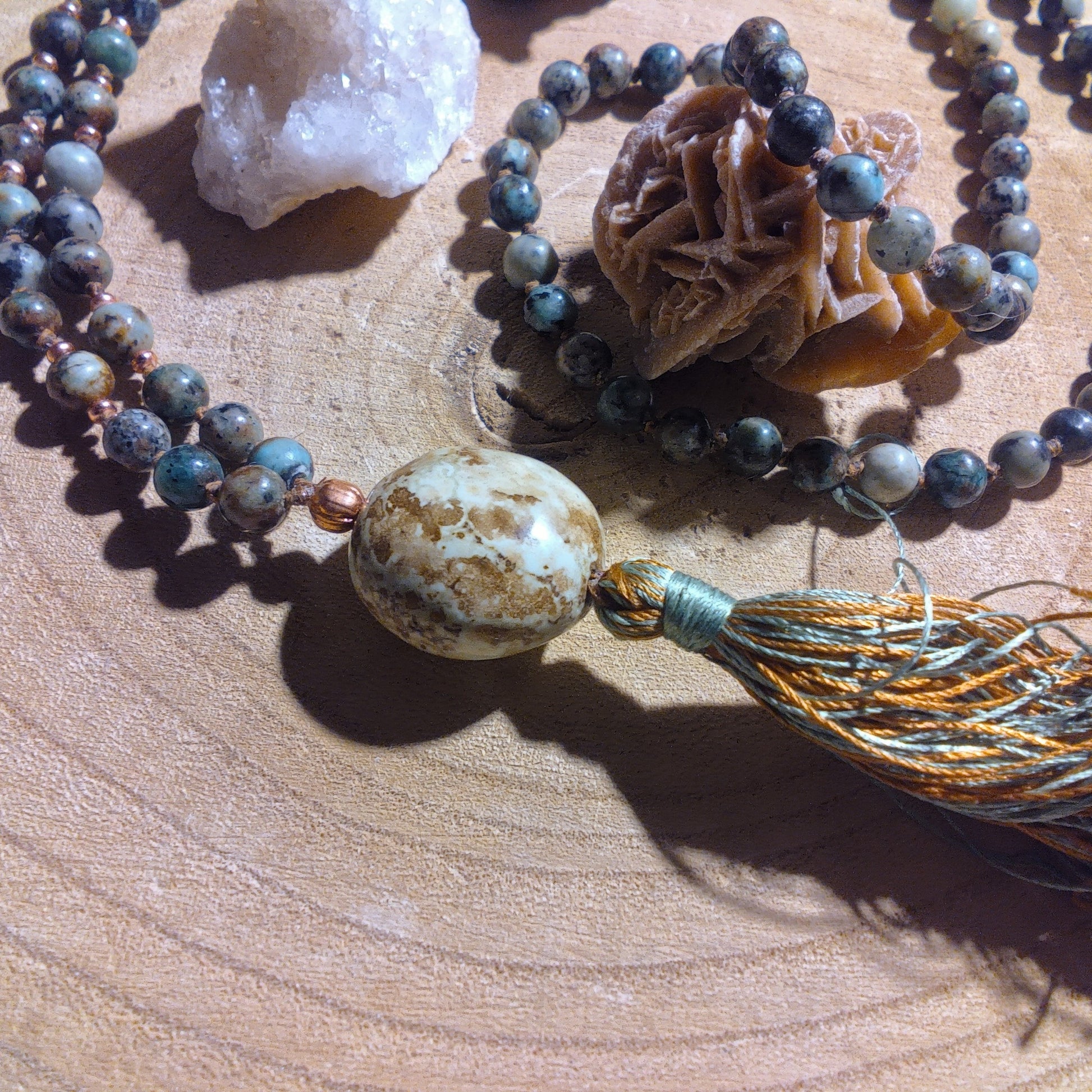 Mala artigianale in Turchese africano, pietra guru in Variscite e Rame