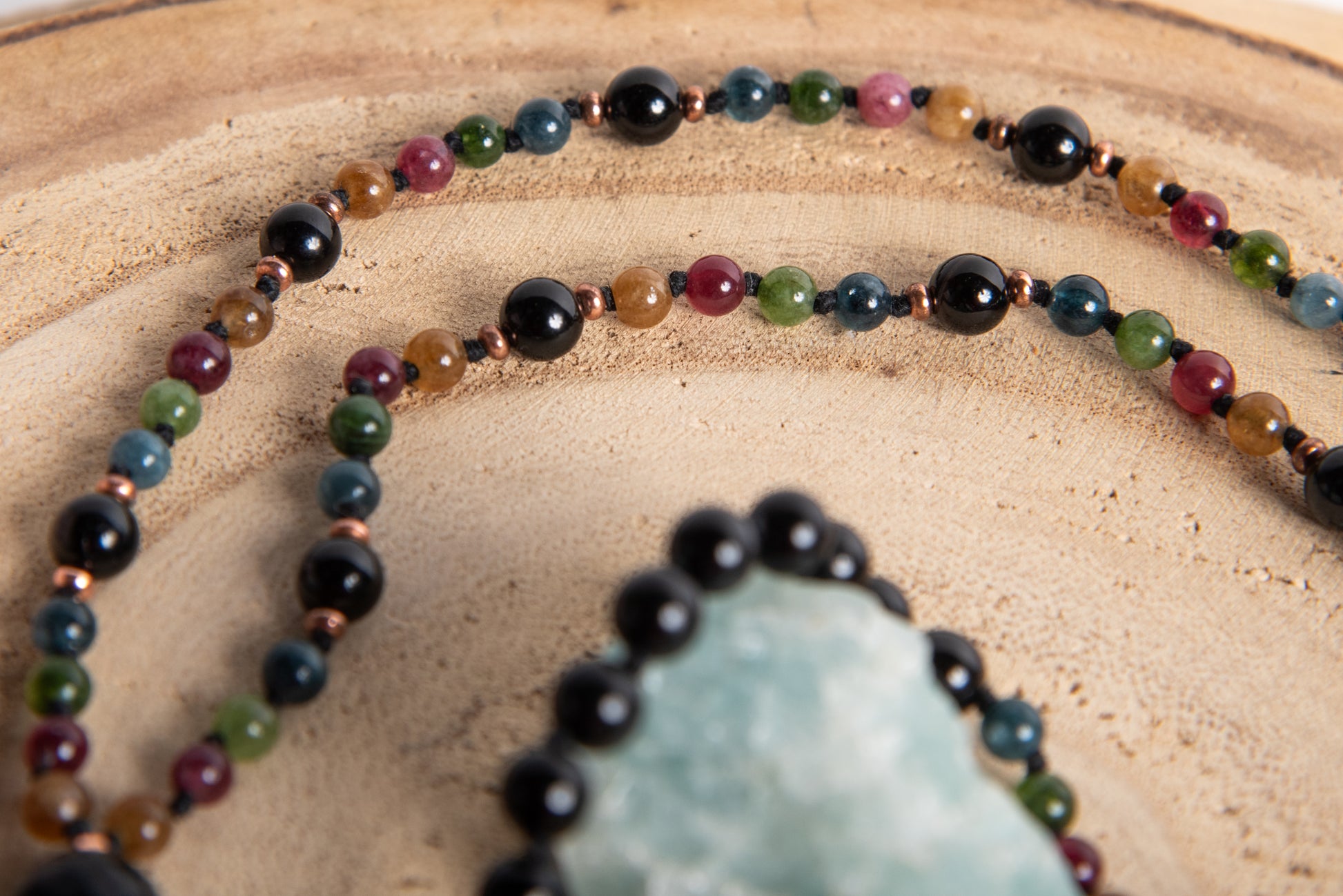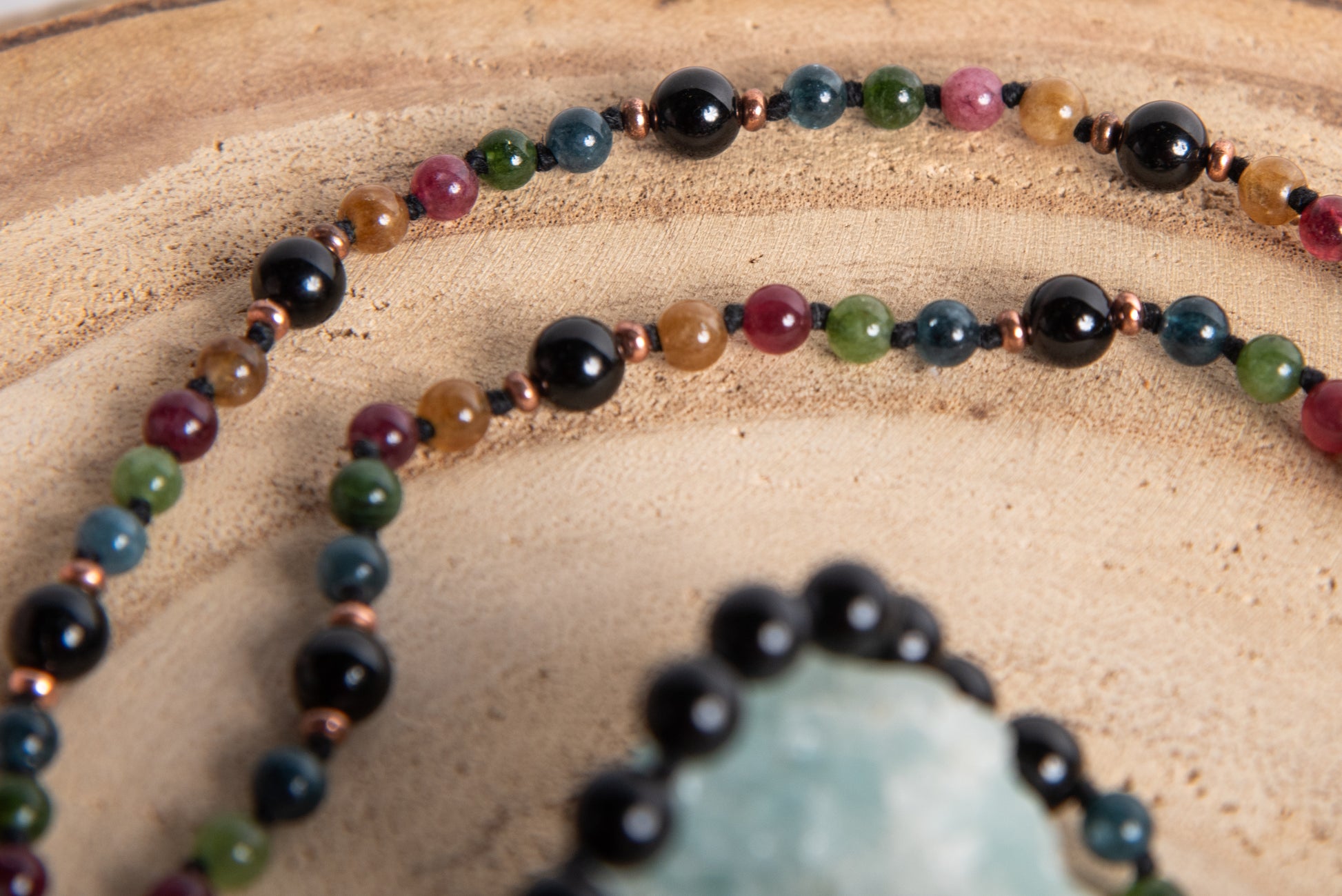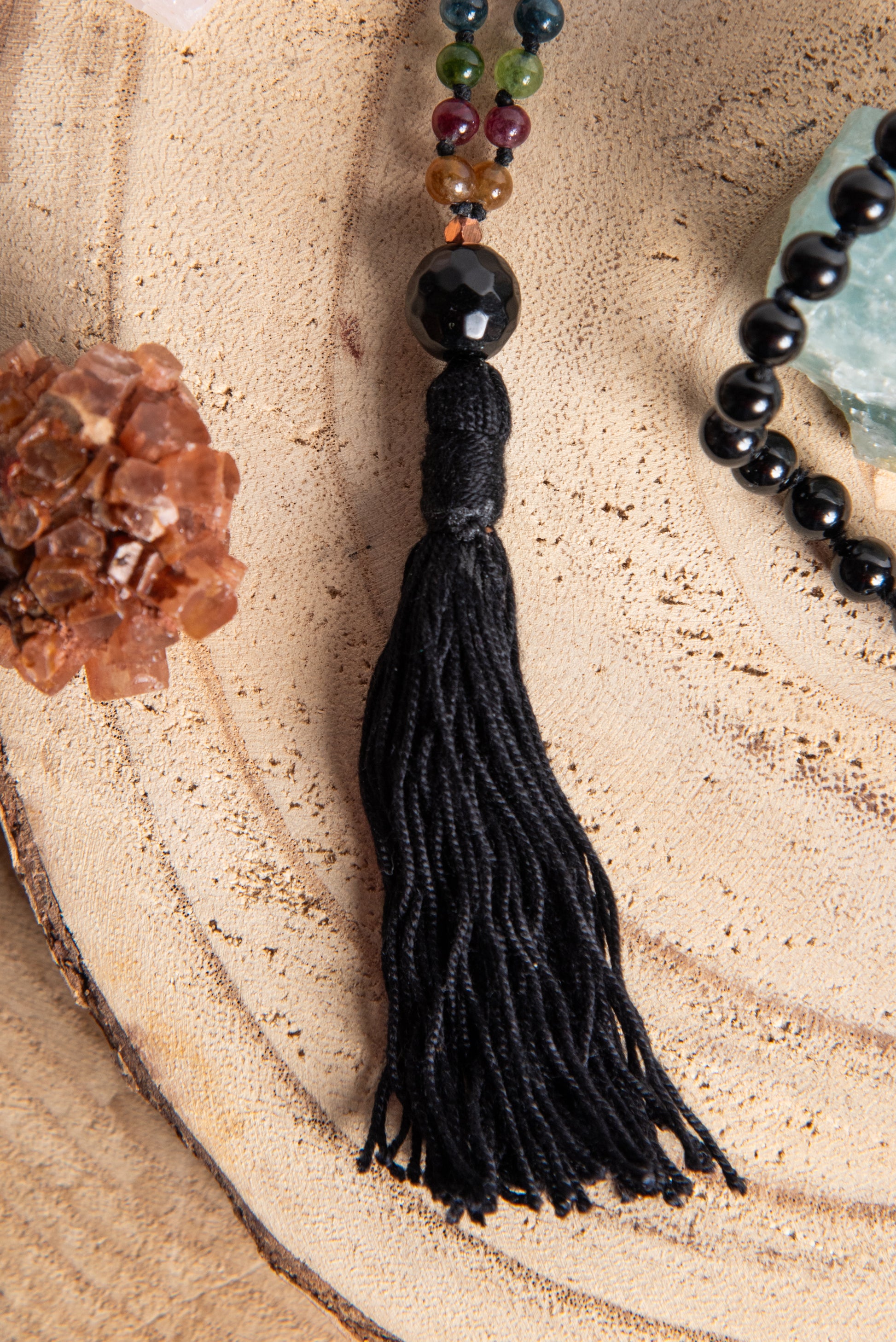 Mala collana 108 perle di Tormalina naturale vari colori e Onice, Pietra Guru Onice, Rame