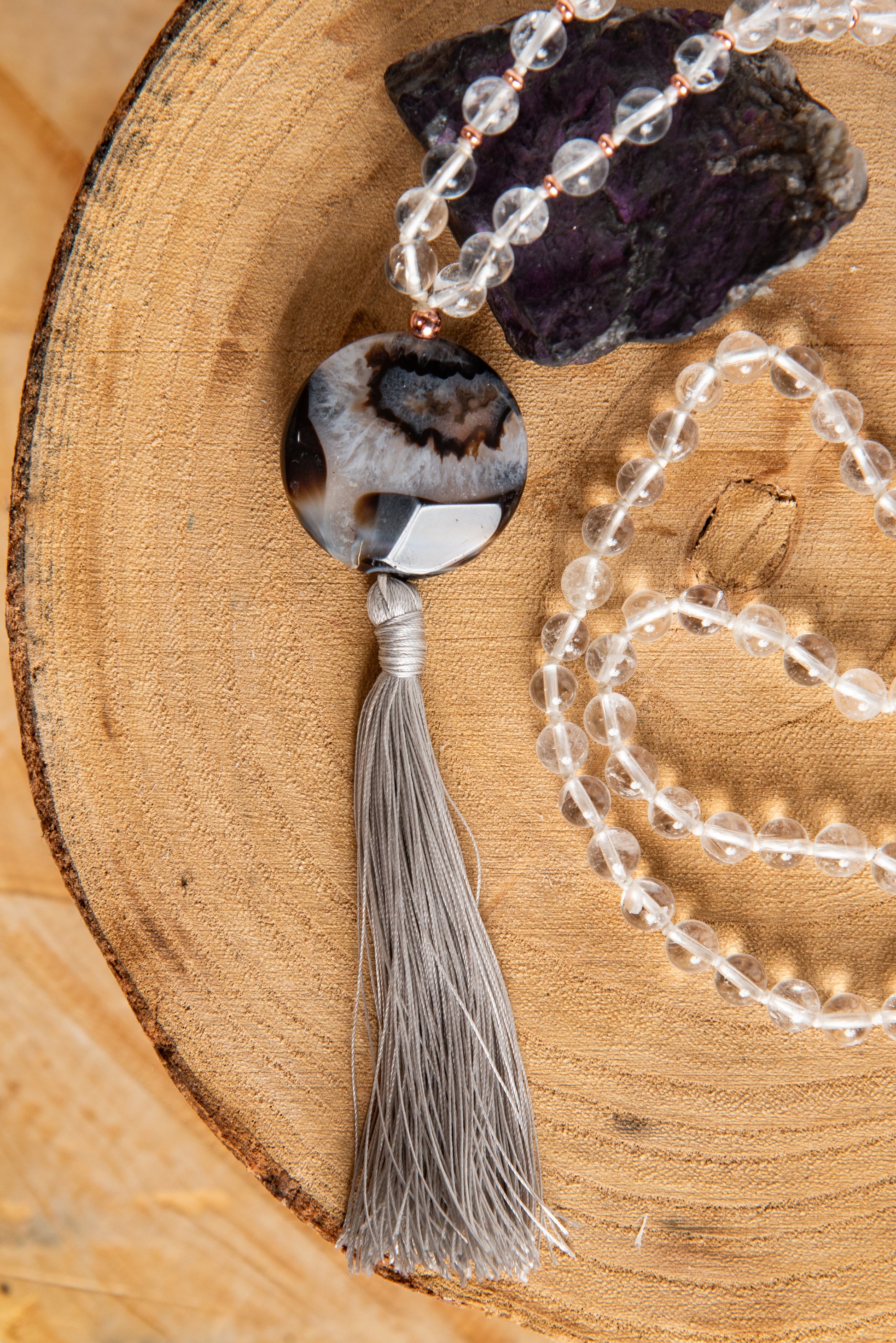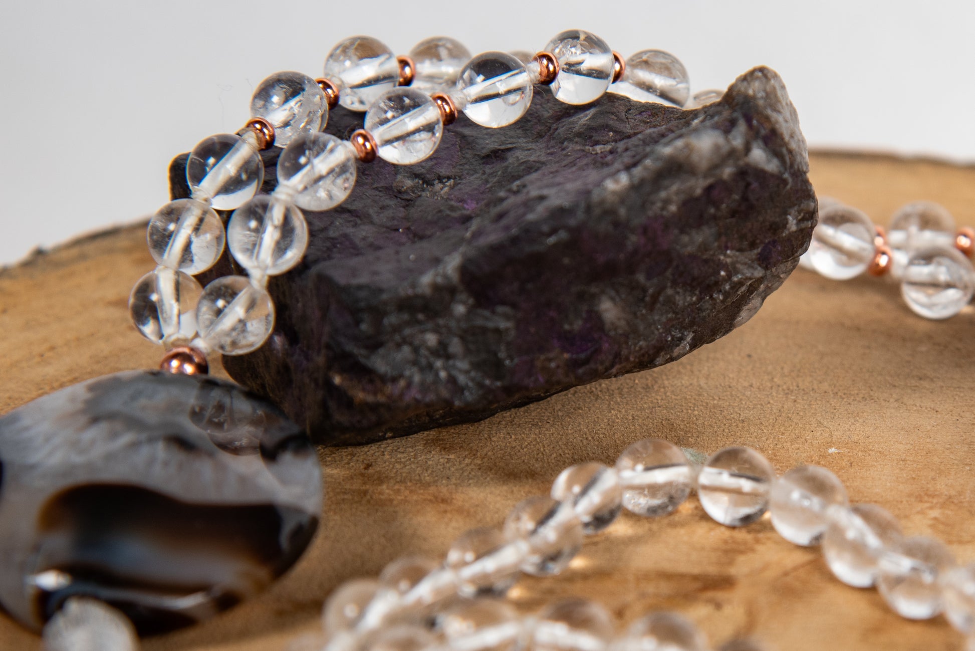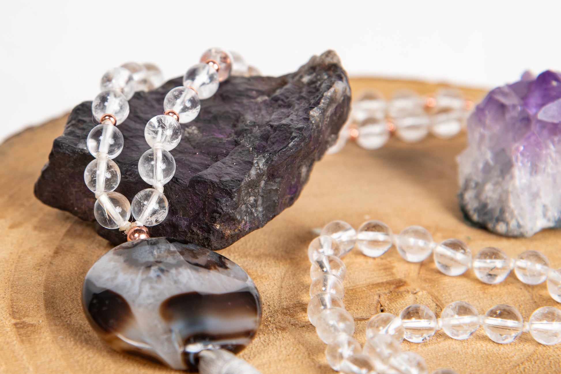Mala collana da meditazione in Cristallo di Rocca, Pietra Guru Agata, Rame