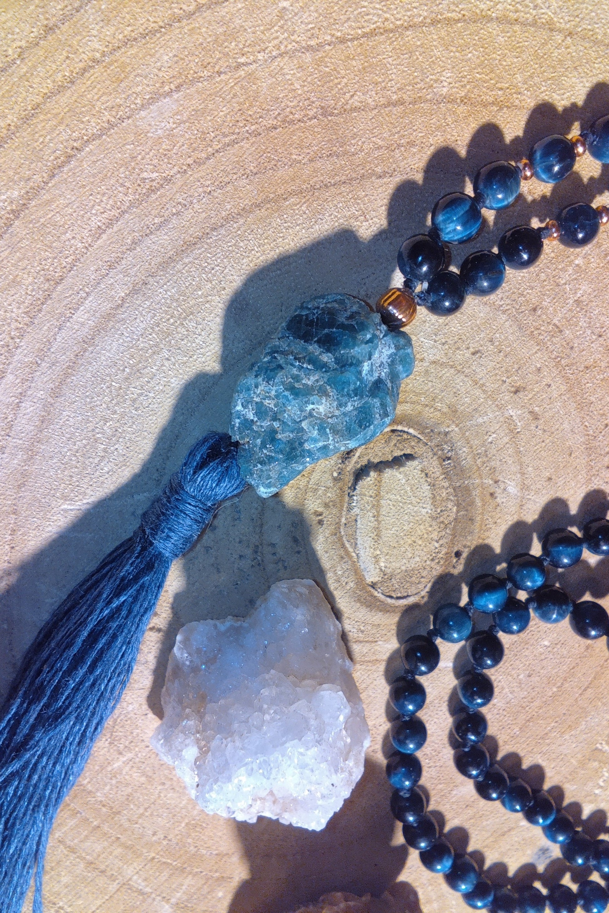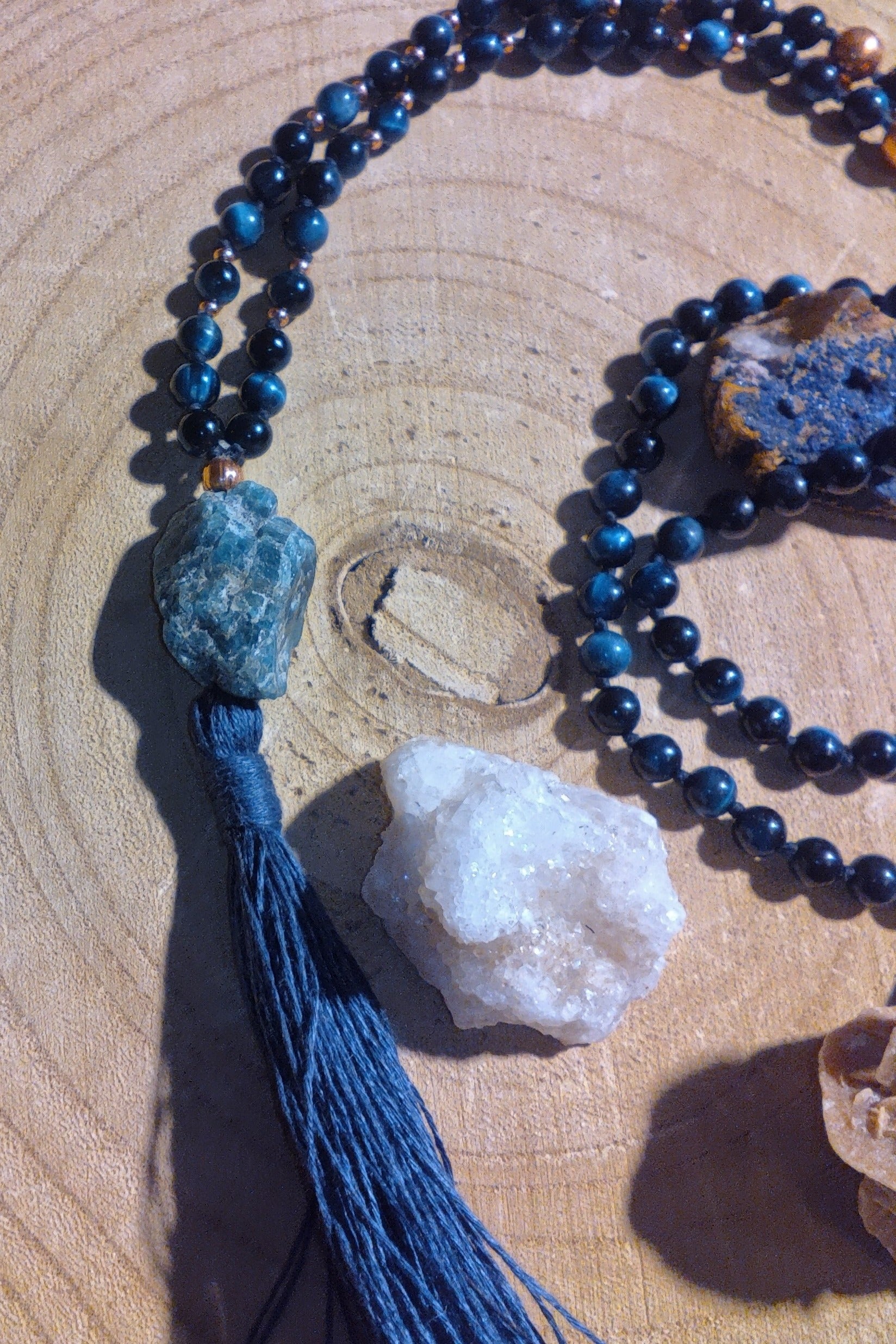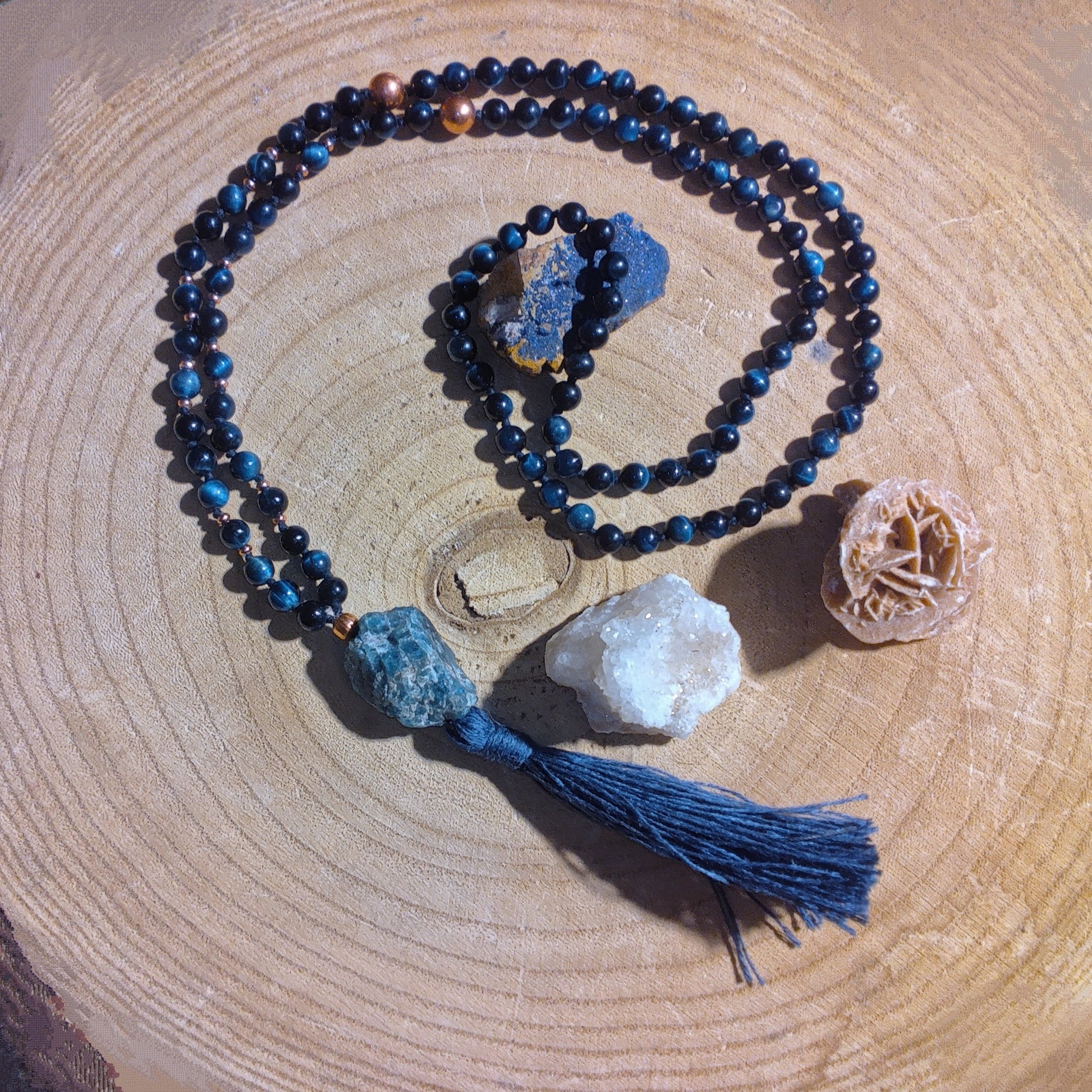 Mala con pietre dure naturali di Occhio di falco, Pietra guru Apatite, Rame