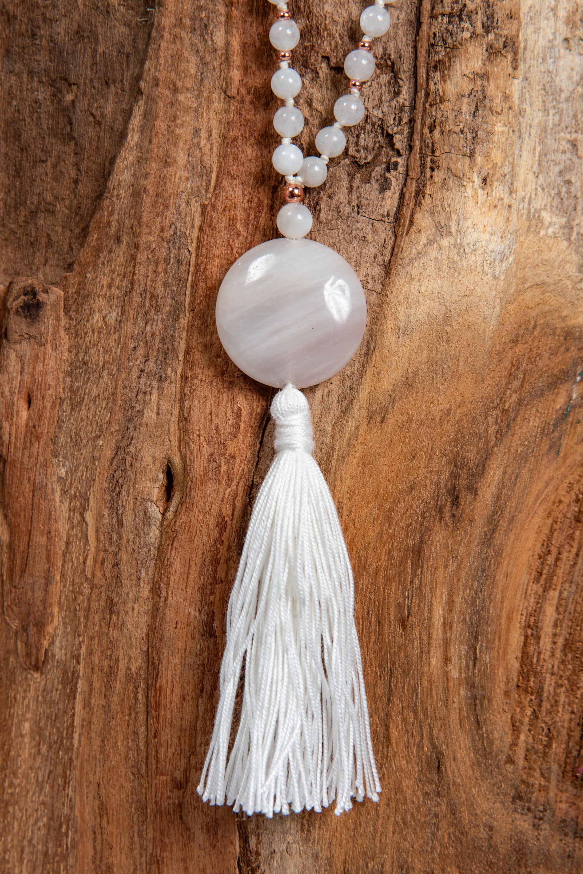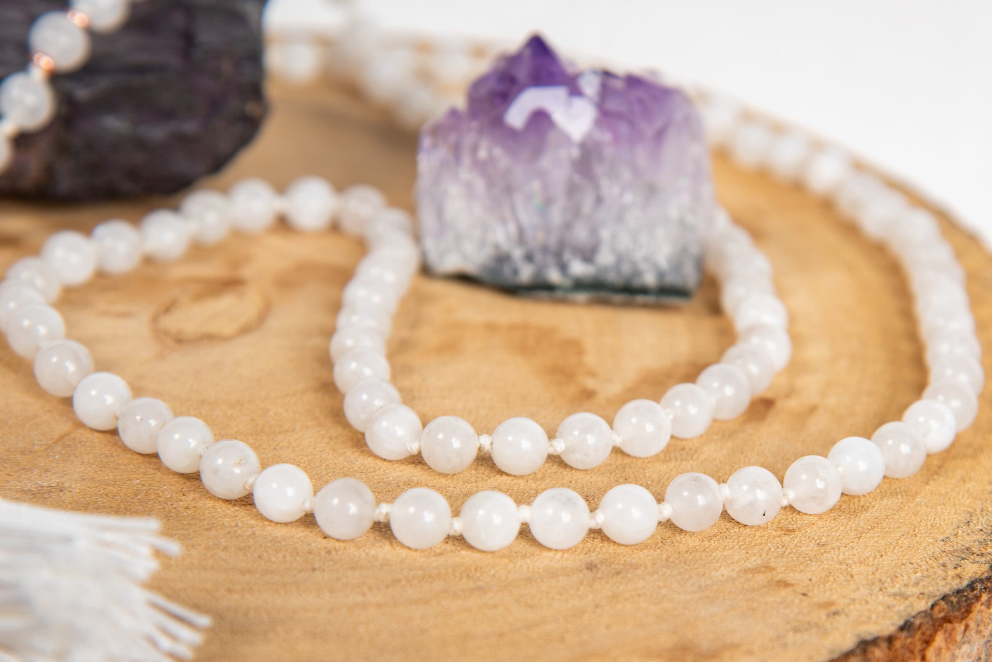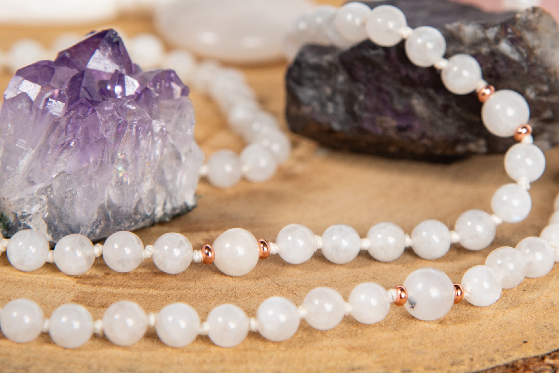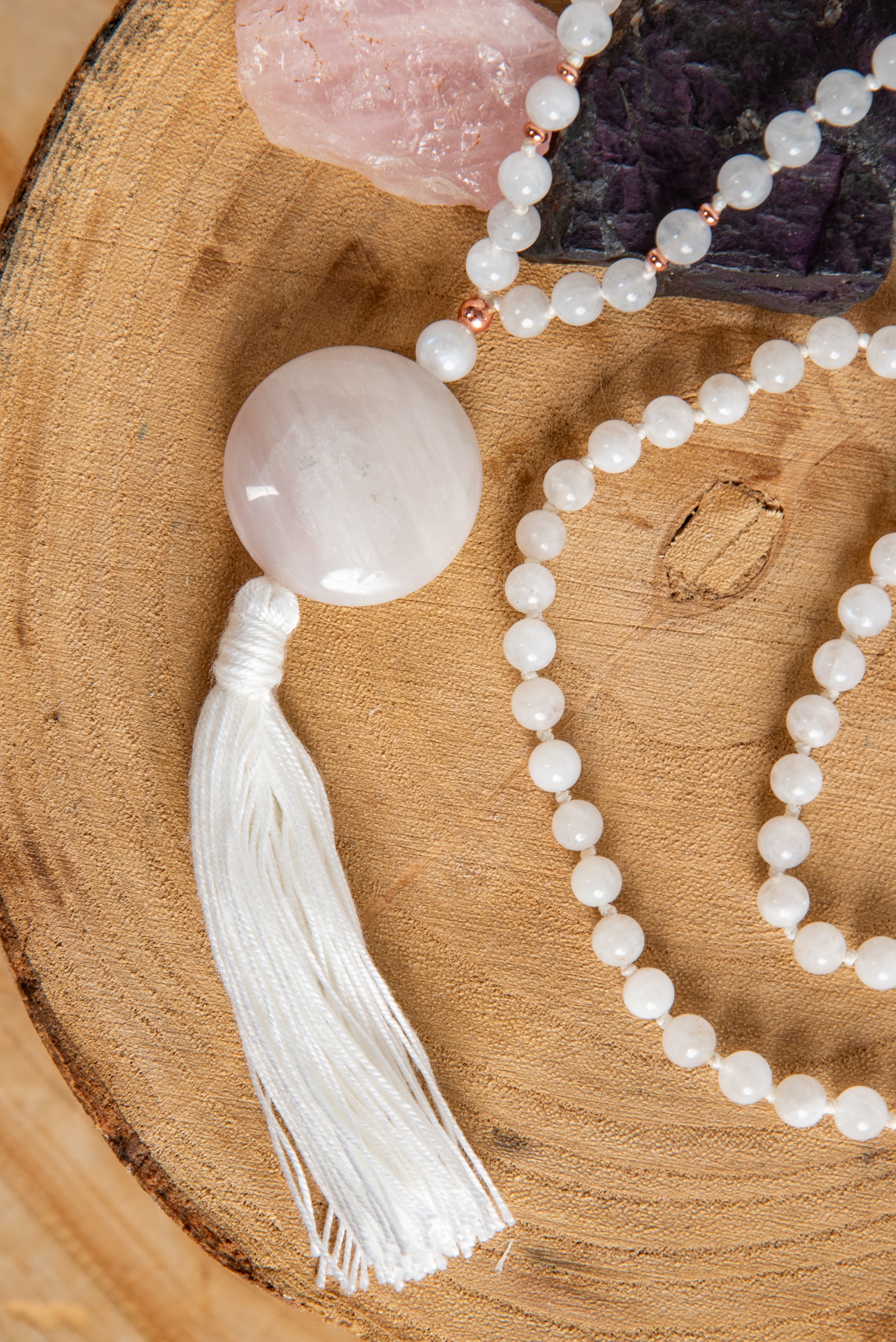 Mala in Quarzite bianca, Pietra guru Calcite bianca, Rame