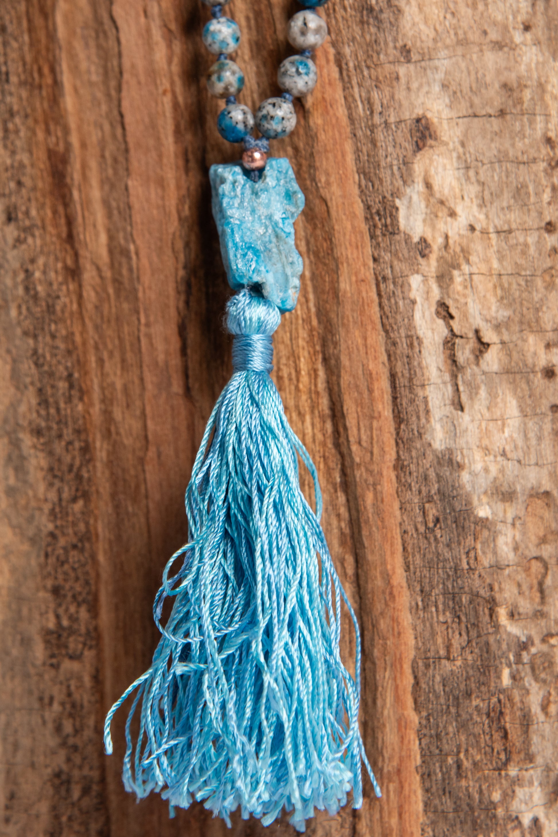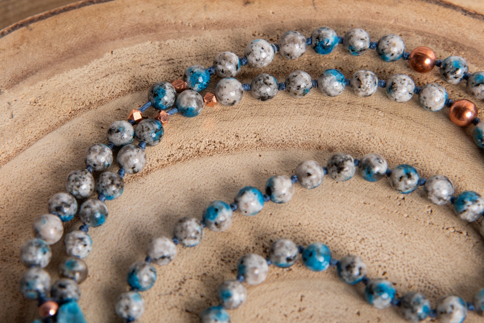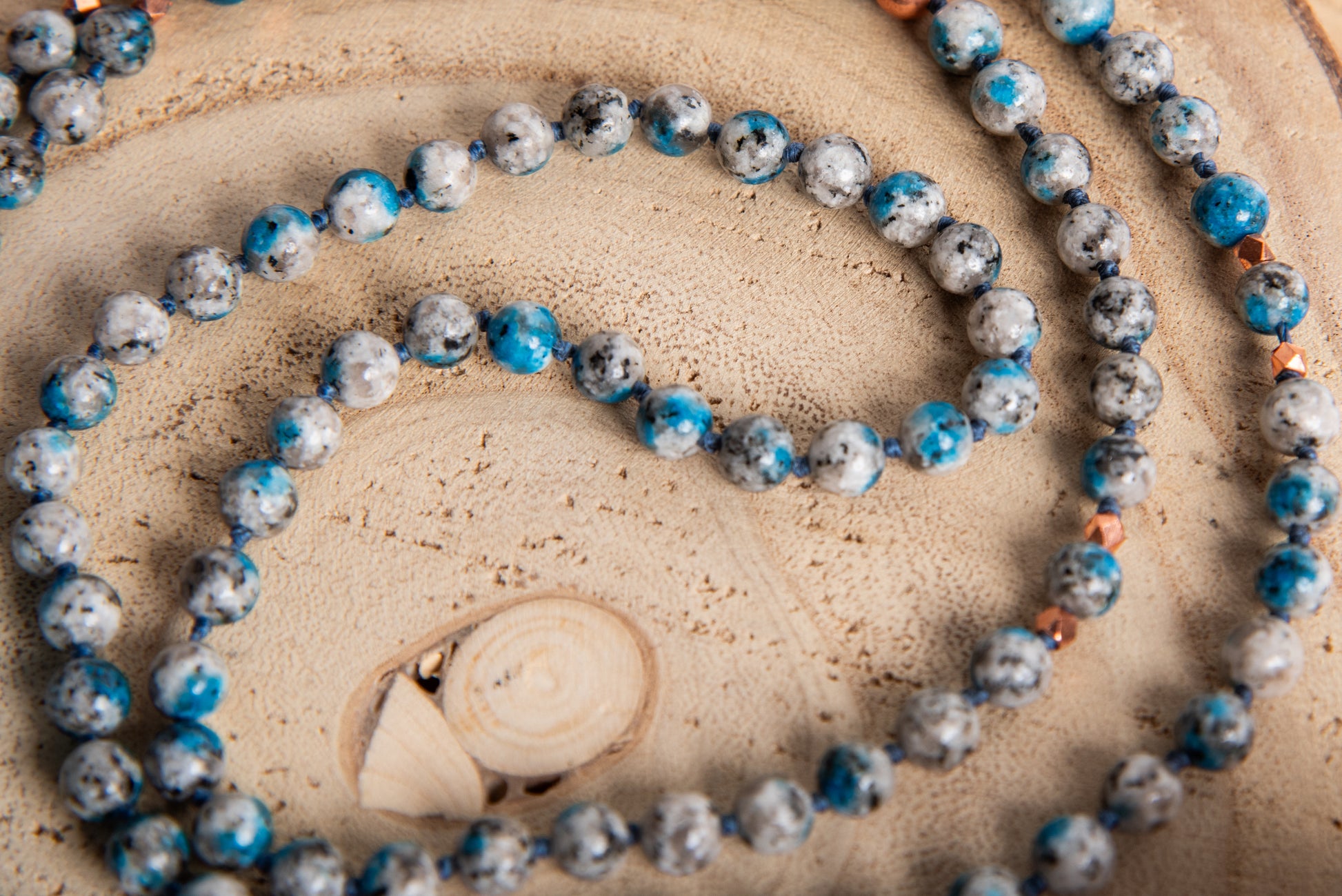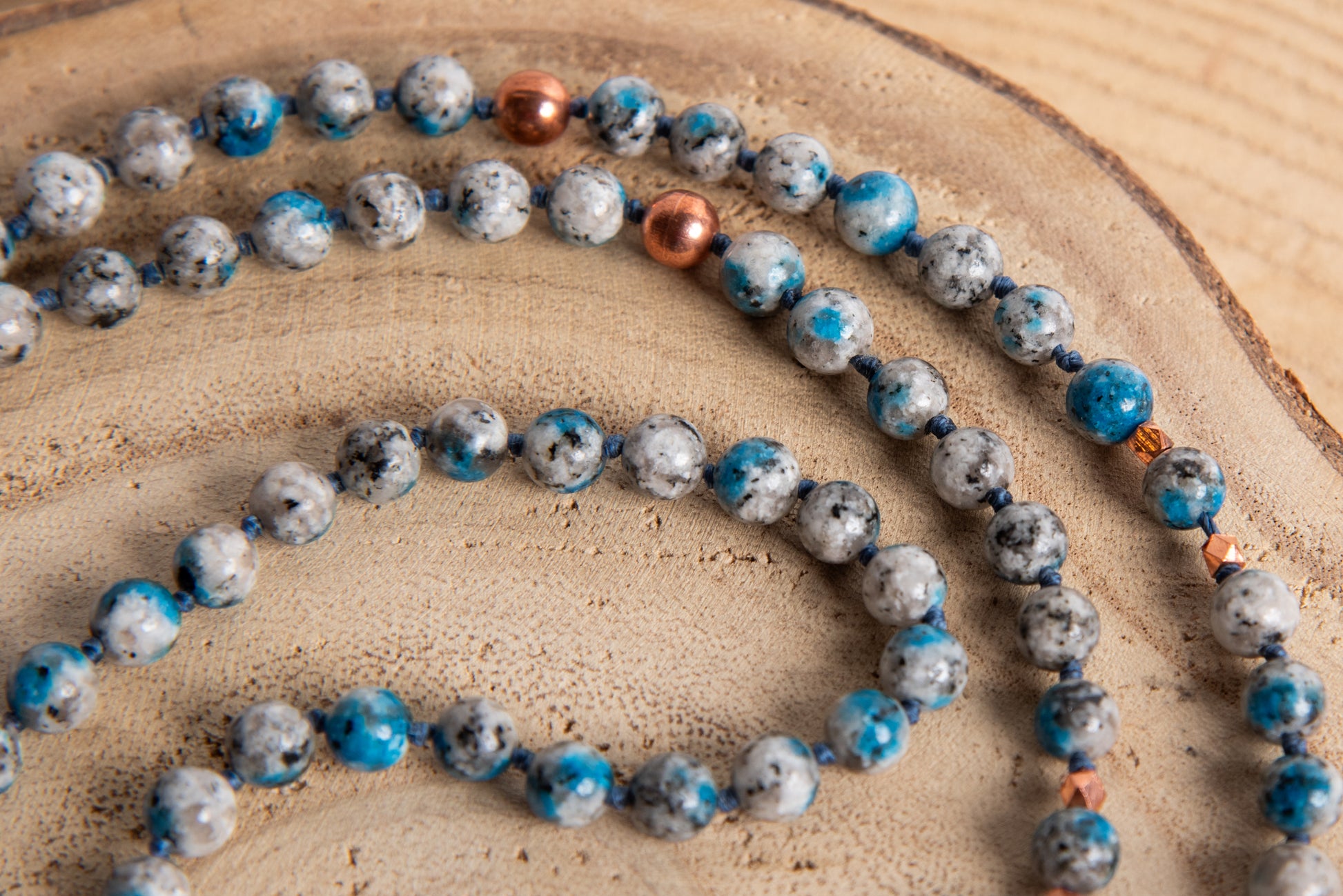 Mala per meditare in Diaspro K2, Pietra Guru Apatite e Rame