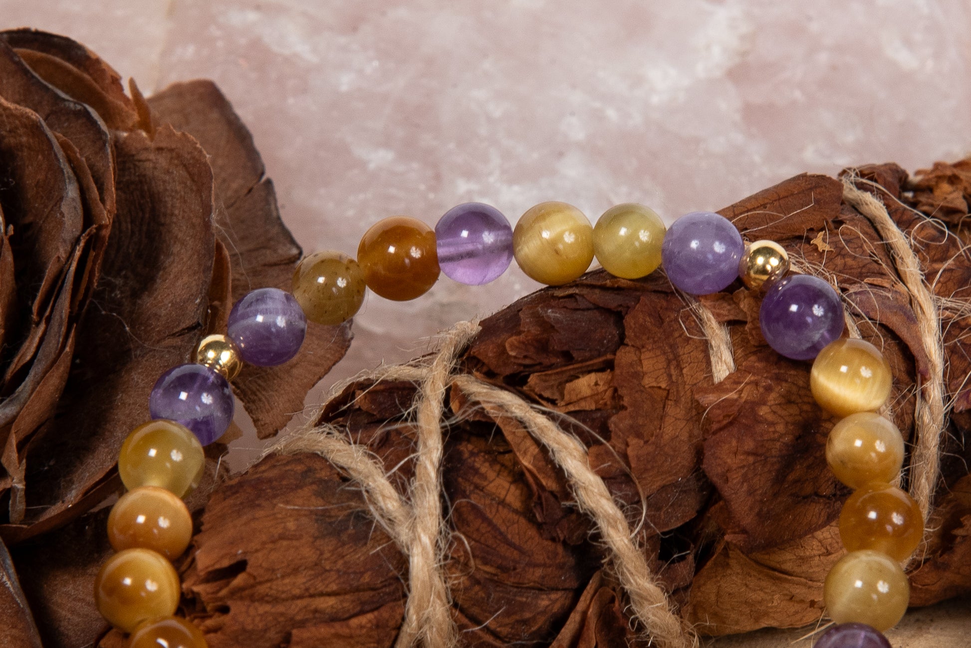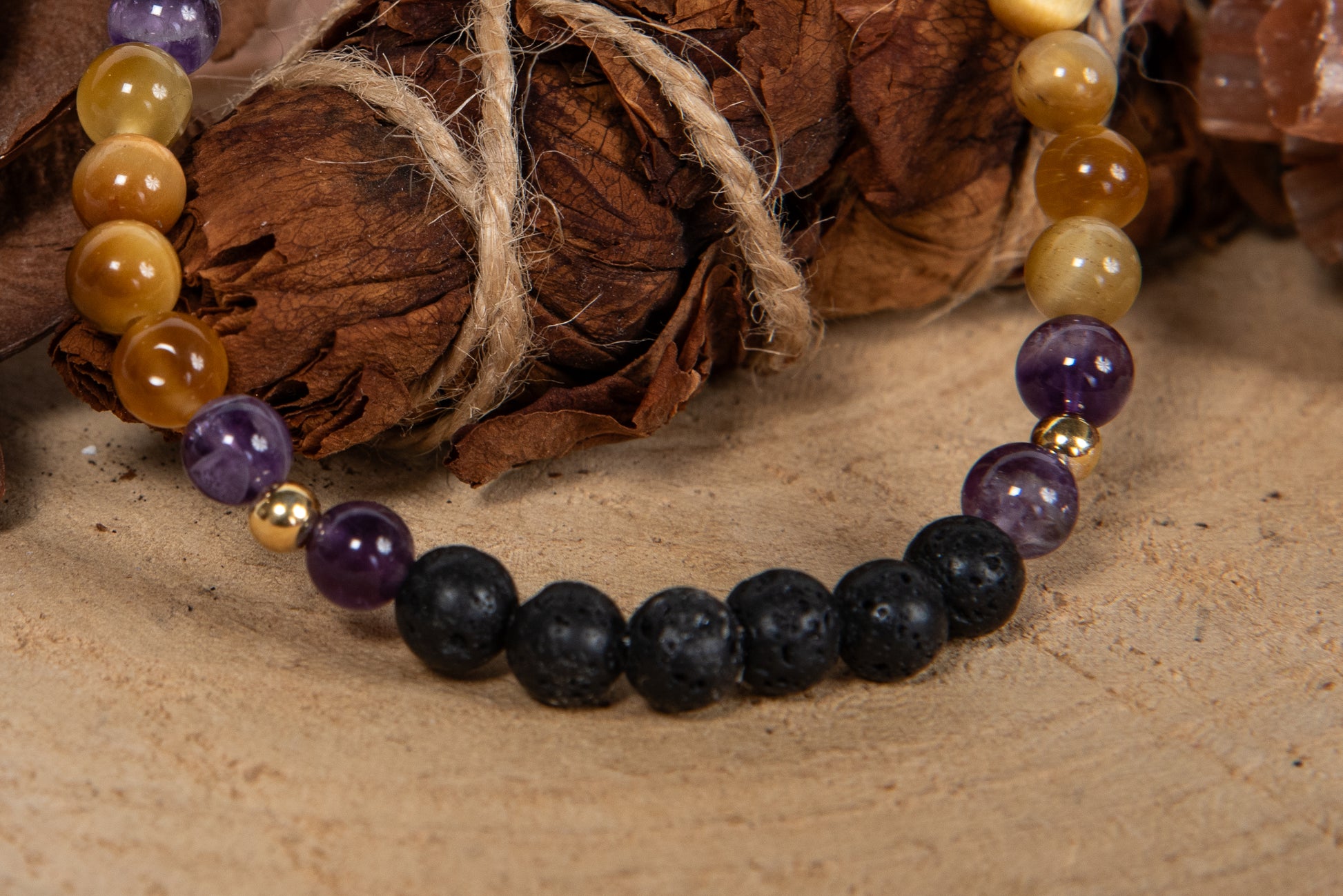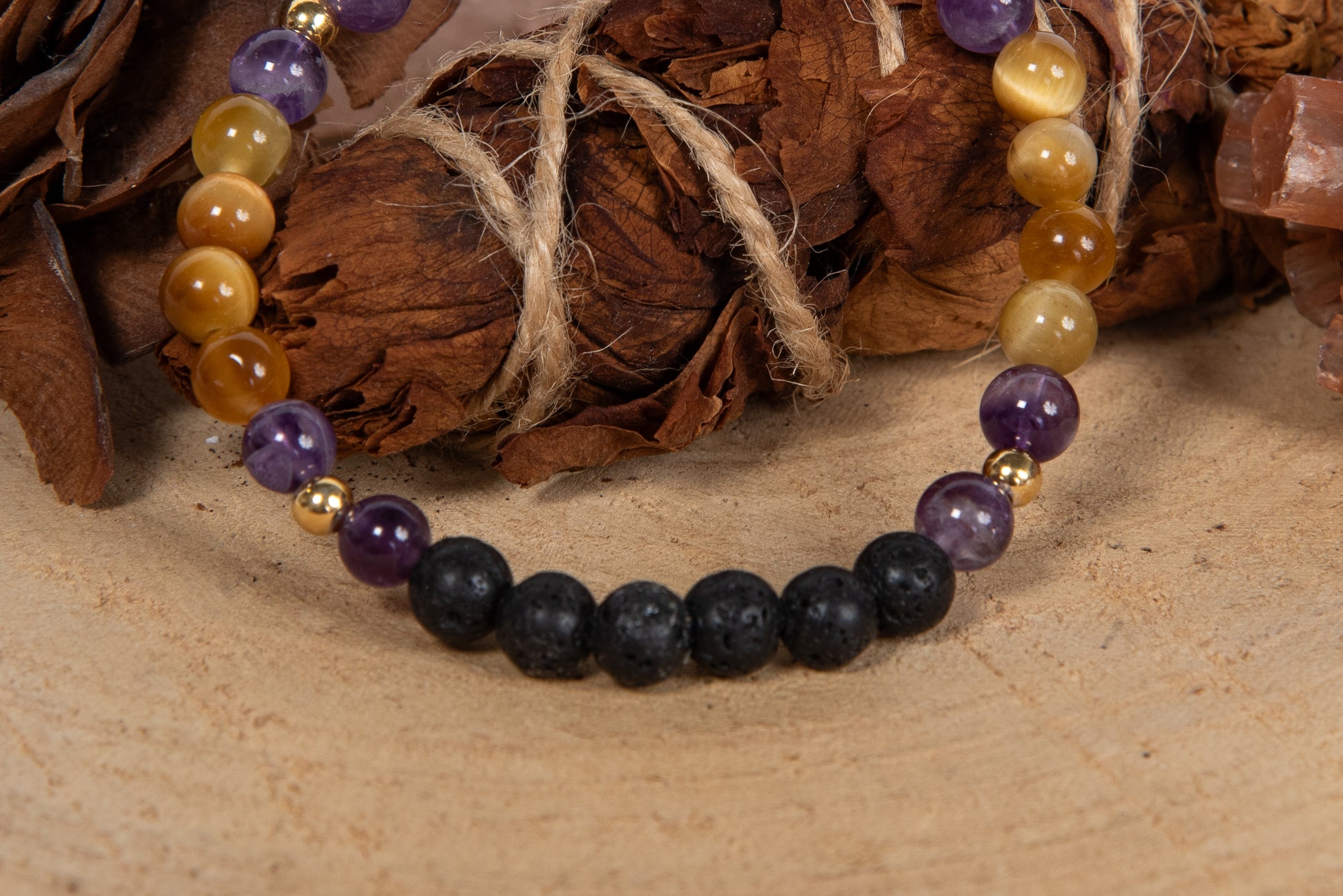 Occhio di tigre dorato, ametista, lava, argento dorato 925